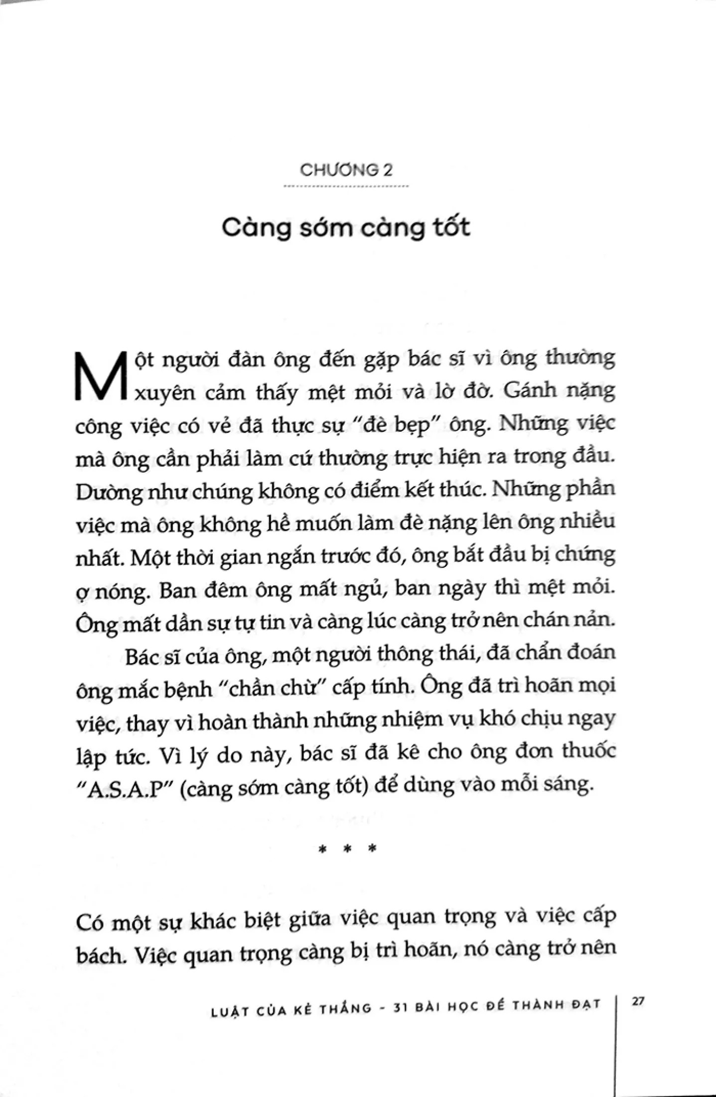 Và trong cuốn sách này, tác giả cung cấp cho chúng ta bộ quy tắc căn bản để đạt được điều ấy. Tất nhiên, để thoát khỏi mê lộ của sợ hãi, trì hoãn và thiếu động lực hòng gây dựng một tương lai tươi sáng, ta phải tuân thủ những quy tắc ấy với quyết tâm sắt đá, và ta sẽ:
