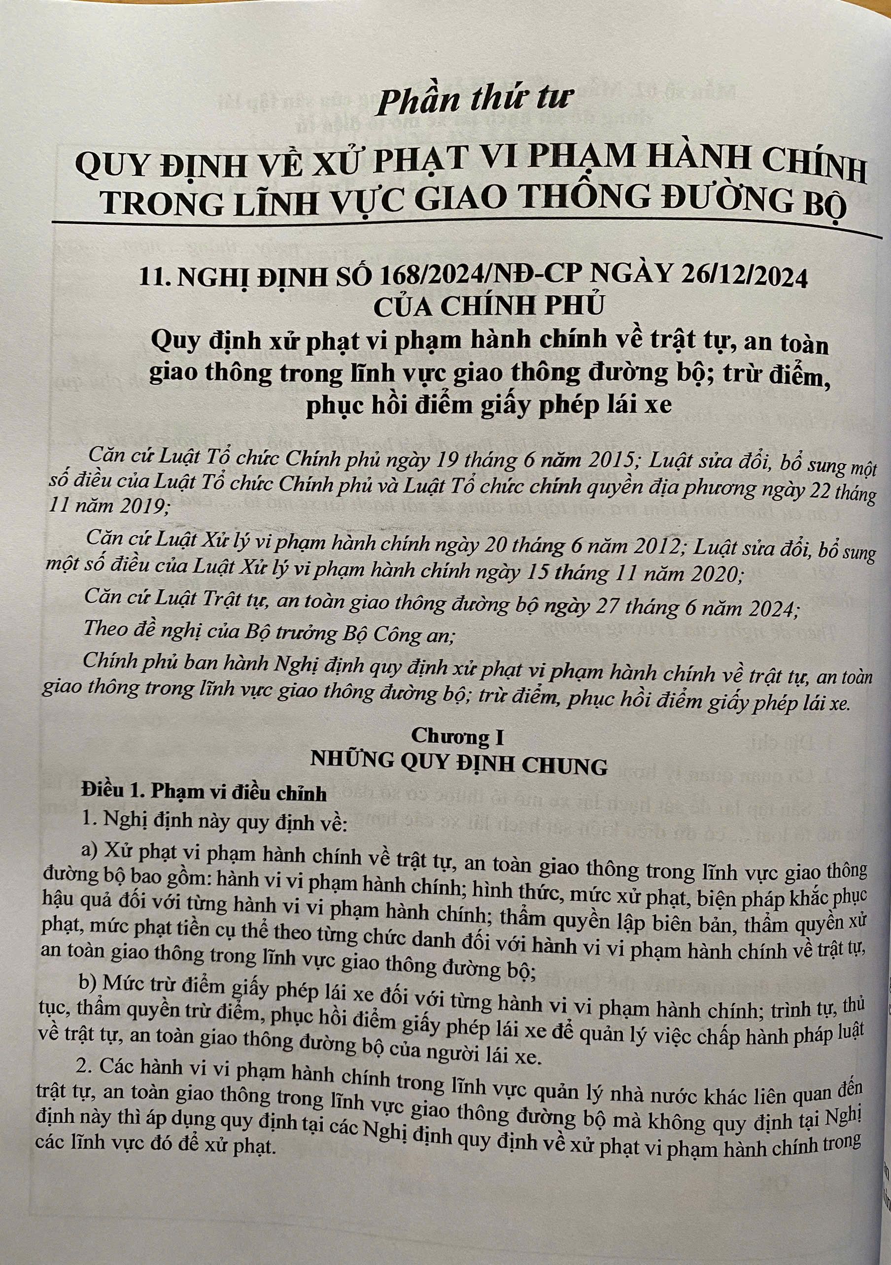 Luật Trật tự, an toàn giao thông đường bộ số 36/2024/QH15 được Quốc hội thông qua ngày 27/6/2024, có hiệu lực thi hành từ ngày 1/1/2025 với nhiêu điêm mới như: thay đổi phân hạng giây phép lái xe; tăng độ tuổi tối đa của người lái xe; bổ sung quy đ. ịnh trừ điêm giây phép lai xe; từ 01/01/2026, không được cho trẻ em dưới 10 tuổi và chiều cao dưới 1,35 mét ngồi cùng hàng ghế tài xế...   Nghị định 168/NĐ-CP ngày 26-12-2024 của Chính Phủ quy định xử phạt vi phạm hành chính trong lĩnh vực giao thông đường bộ, trừ điểm, phục hồi điểm giấy phép lái xe, thay thế cho Nghị định 100/2019 (sửa đổi, bổ sung tại Nghị định 123/2021) sẽ tăng mức xử phạt vi phạm hành chính rất cao, có những lỗi gấp cả chục lần so với trước đây.   Nhằm góp phần phổ biến những quy định pháp luật mới về an toàn giao thông đường bộ cho các cơ quan ban ngành , cá nhân trong và ngoài nước Luatvietbook xin trân trọng giới thiệu cuốn sách " LUẬT TRẬT TỰ, AN TOÀN ĐƯỜNG BỘ VÀ VĂN BẢN HƯỚNG DẪN "