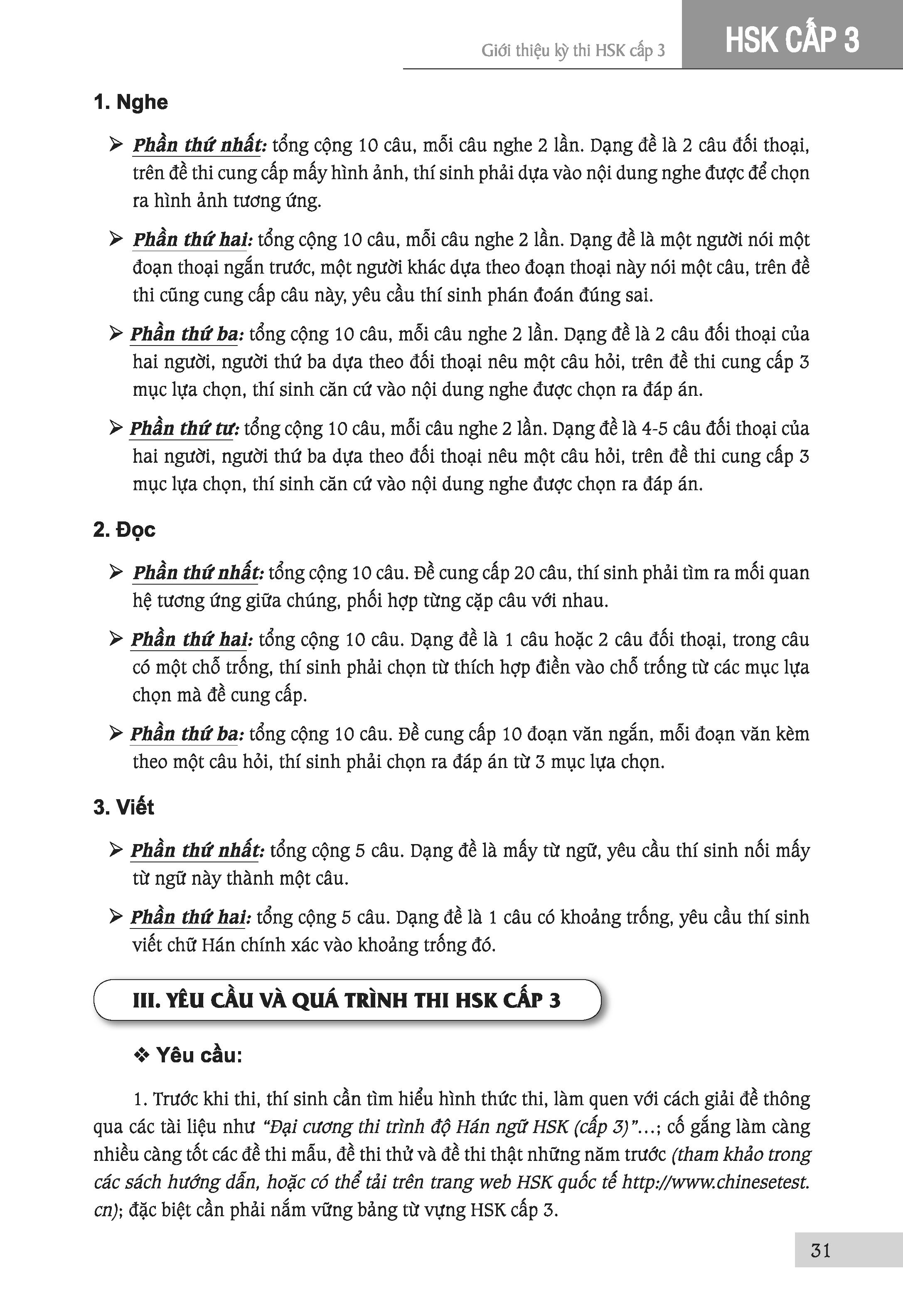 Cuốn sách "Chinh phục đề thi HSK 3" là một tài liệu hữu ích đối với các thí sinh đang ôn thi HSK. Cuốn sách phân tích chi tiết các dạng đề bài, từ vựng, ngữ pháp