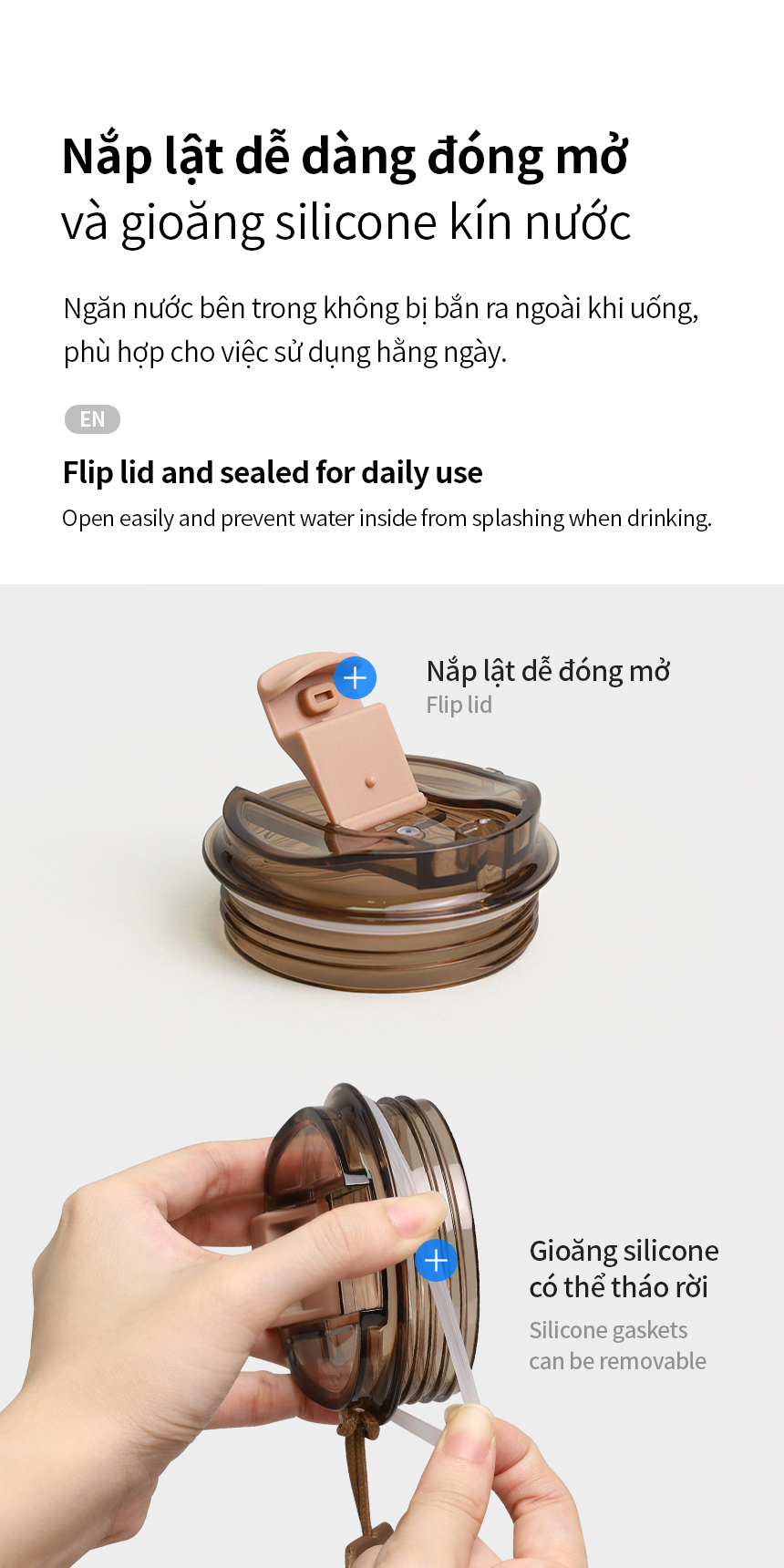 Nắp lật dễ dàng đóng mở và gioăng silicone kín nước phù hợp cho việc sử dụng hàng ngày.