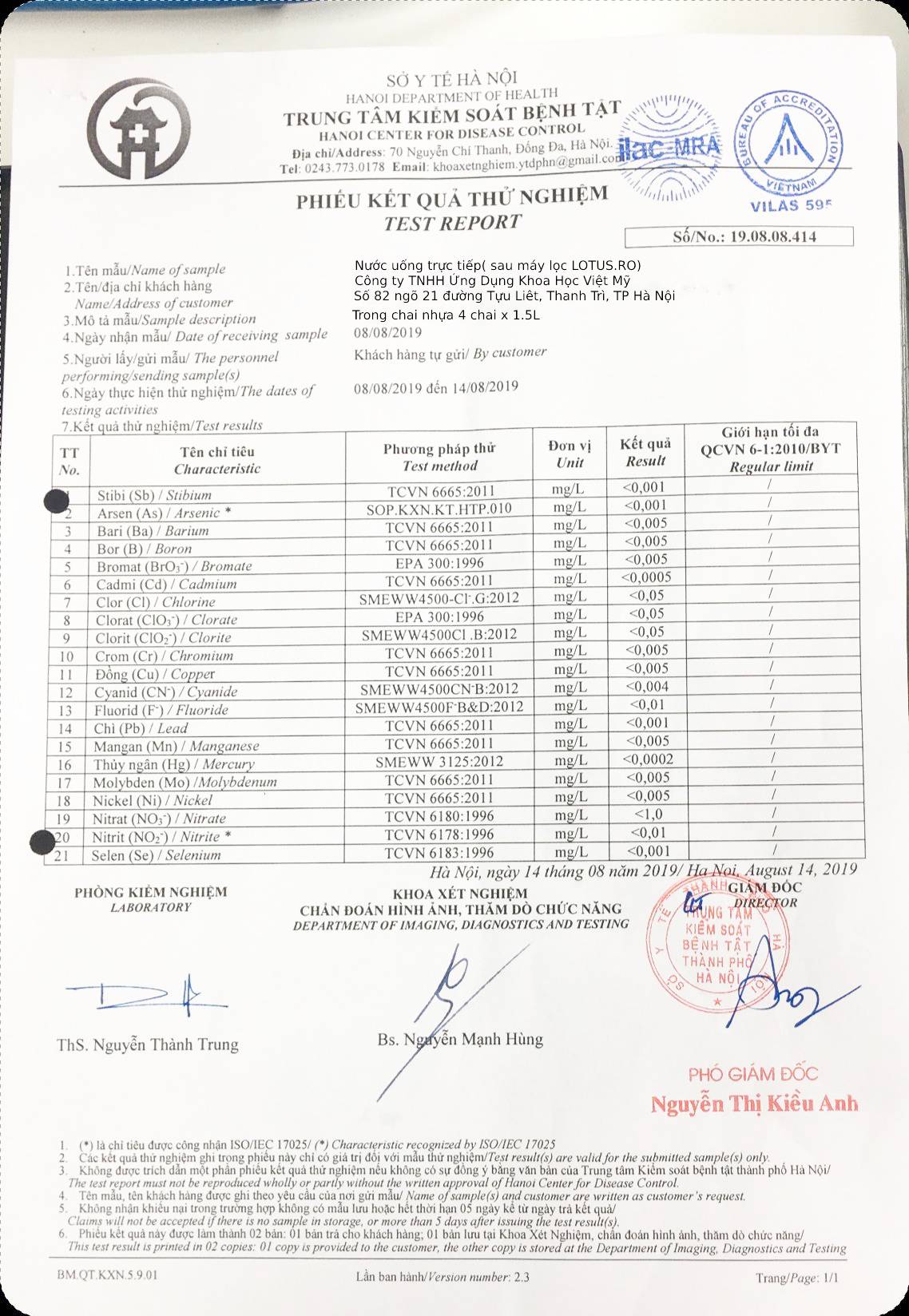 Kết quả test chất lượng nước sau máy lọc LOTUS.RO (Mới nhất 2019)
