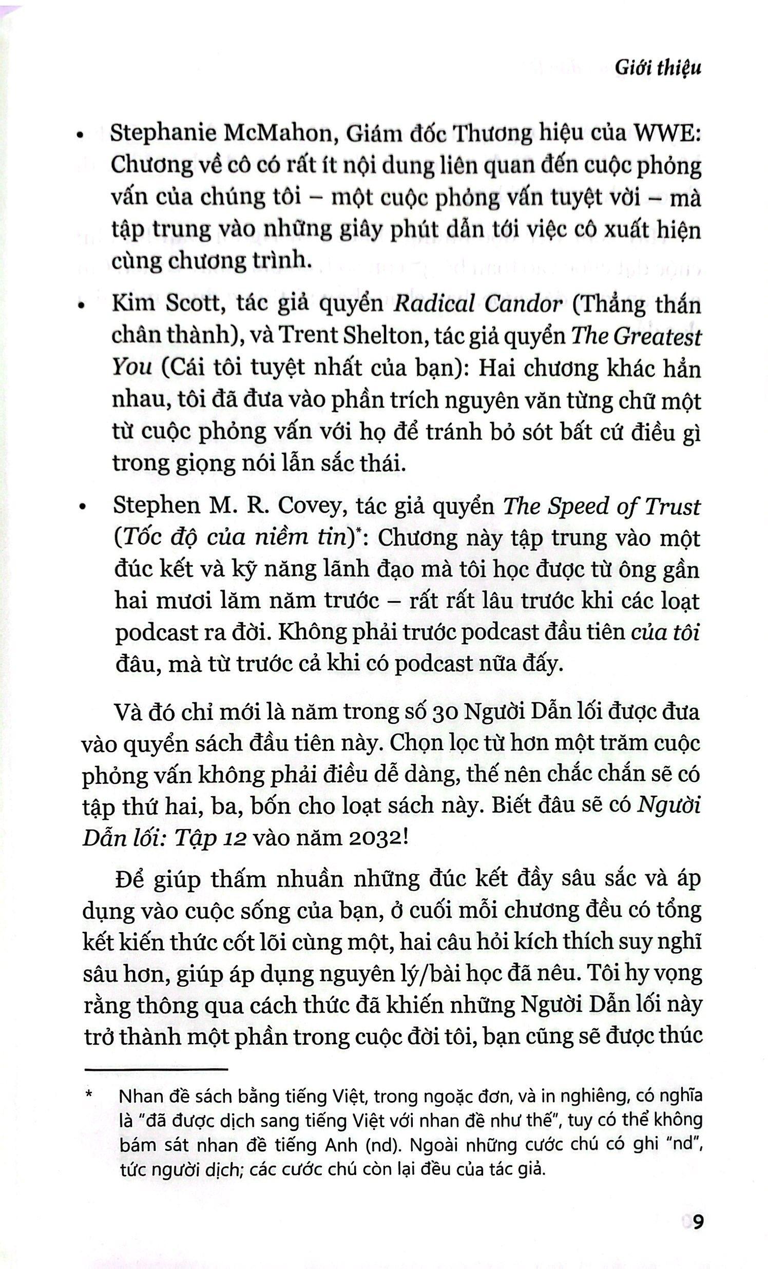 Thực ra mà nói, mỗi chương có thể cho bạn nhiều hơn một bài học, tuỳ vào góc nhìn, trải nghiệm sống, trạng thái hiện tại của bạn khi đọc quyển sách. Không phải ai cũng có cơ hội gặp gỡ, trò chuyện cùng những con người như Nick Vujicic, Daniel Pink, tướng Stanley McChrystal, Seth Godin,… Chỉ cần học một bài học từ mỗi con người đó thôi, cuộc sống, sự nghiệp của mỗi chúng ta đã có thể tích cực, tốt đẹp hơn rất nhiều rồi.
