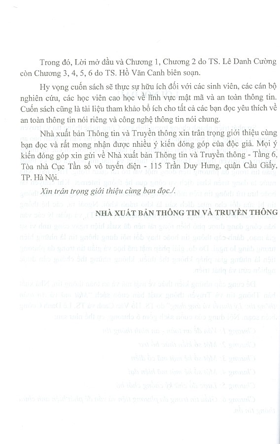Cung cấp các kiến thức về mật mã và an toàn thông tin bao gồm: vấn đề an toàn - an ninh thông tin, một số kiến thức bổ trợ, một số hệ mật mã