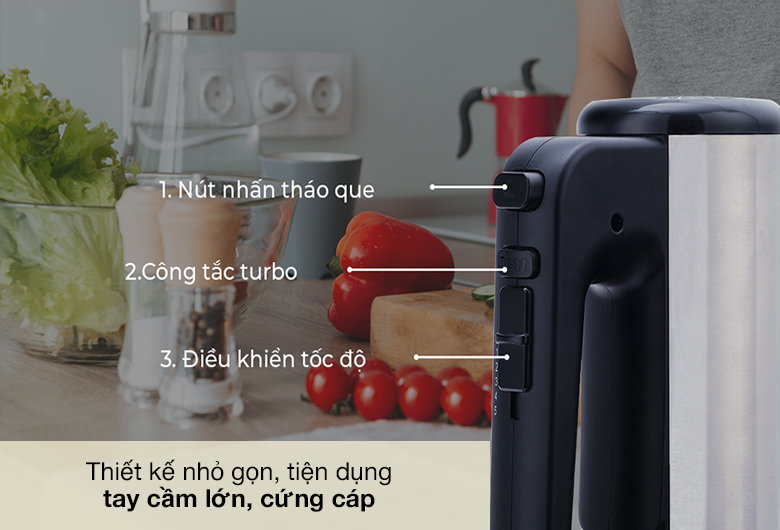 Động cơ 375W êm ái nhưng mạnh mẽ 4 mức tốc độ. Thêm nút quay nhanh Thích hợp sử dụng bằng tay phải hoặc trái Dễ vệ sinh Có nút nhả cho thanh đánh trứng