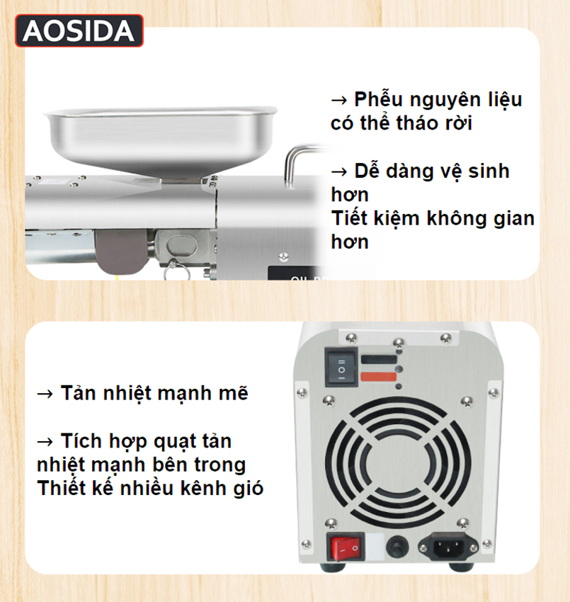 Máy ép dầu ăn thực vật nóng và lạnh dùng trong gia đình thương hiệu Anh Quốc AOSIDA 999A Aosida là thương hiệu nổi tiếng đến từ Anh Quốc, Aosida là hãng chuyên sản xuất các sản phẩm gia dụng và linh kiện điện tử xuất khẩu toàn thế giới. Với mục tiêu vì sức khoẻ cộng đồng, các sản phẩm do hãng cung cấp đều đạt Chứng nhận chất lượng Châu Âu: ROHS, 3C, CE, EMC, ERP, LFGB, REACH, FCC Vấn đề sức khỏe hiện nay đang rơi vào tình trạng đáng báo động khi, các chủ cơ sở sản xuất, hộ kinh doanh dầu ăn chỉ chạy theo lợi nhuận mà bất chấp cung cấp ra thị trường các loại dầu ăn giả, kém chất lượng, gây tổn hại đến sức khỏe và tính mạng người tiêu dùng. Cách tốt nhất bảo vệ bản thân và mọi người trong gia đình đó chính là tự ép dầu thực vật ngay tại nhà. Giới thiệu máy ép dầu thực vật nóng và lạnh dùng trong gia đình Aosida 999A là dòng sản phẩm nâng cấp từ mã 888A với công suất và chất lượng vượt trội như: Công suất cao, màn hình điện tử dễ dàng thao tác, buồng ép lớn cho ra dầu trong hơn, ép nóng và lạnh, hoạt động liên tục 24h....