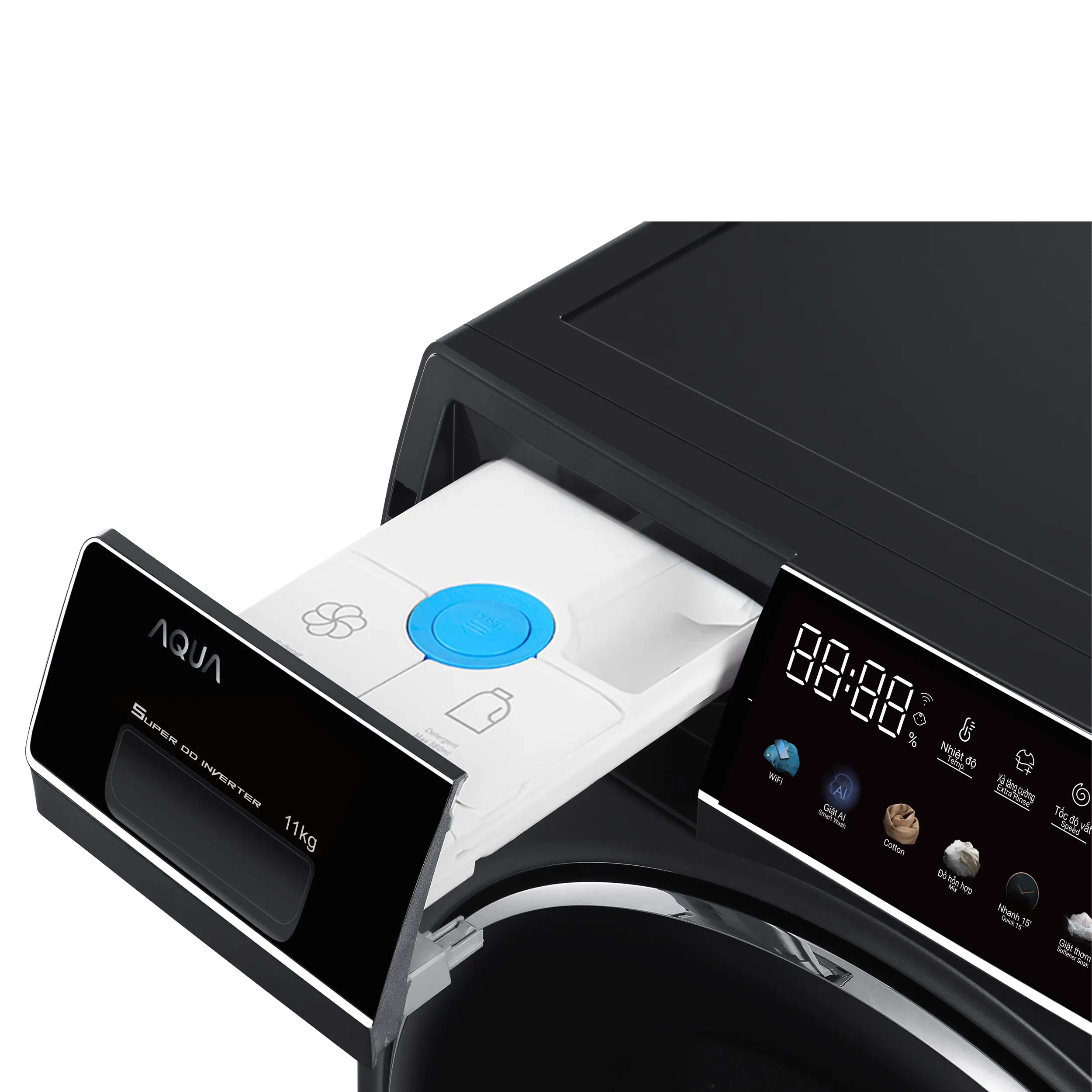 Trên tay máy giặt lồng ngang AQUA Color AI AQD-DDW1100J