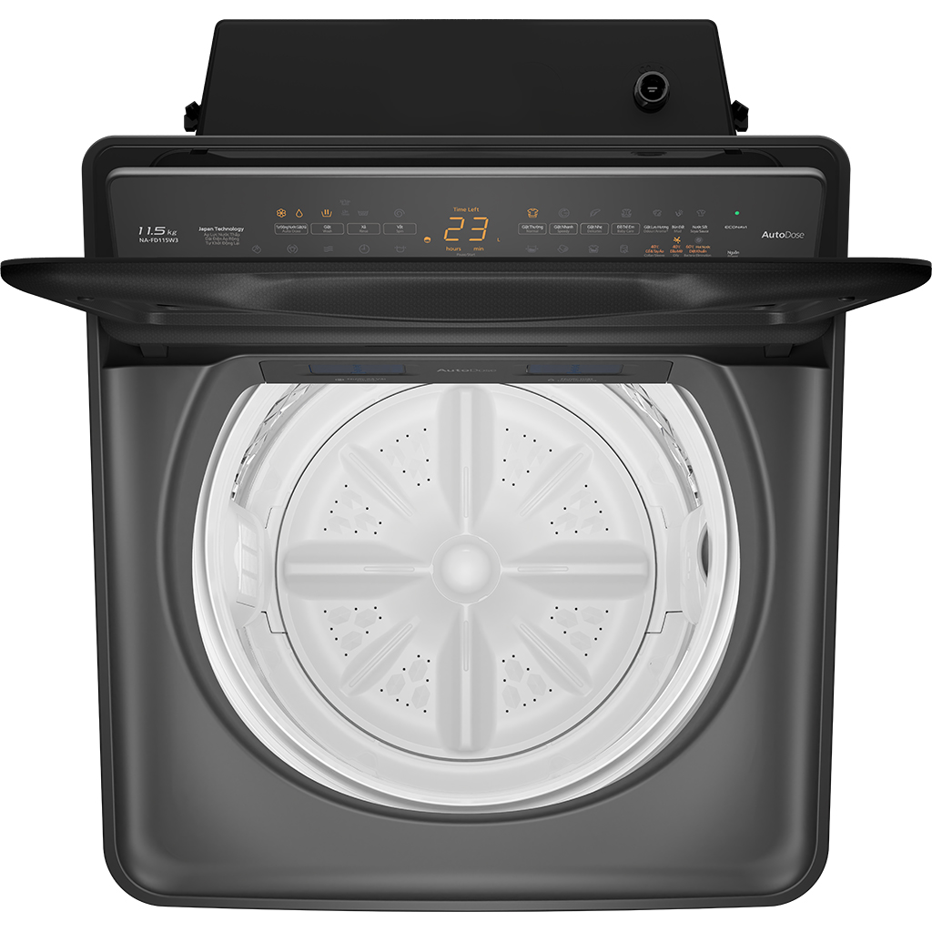 Thông số kỹ thuật Model: NA-FD115W3BV Màu sắc: Đen Nhà sản xuất: Panasonic Xuất xứ: Việt Nam Năm ra mắt : 2023 Thời gian bảo hành: 24 Tháng     Loại máy giặt: Cửa trên Khối lượng giặt: 11.5 kg Chế độ giặt: 14 chương trình   Trải nghiệm giặt giũ thảnh thơi với hàng loạt công nghệ thông minh Máy giặt Panasonic Inverter 11.5 kg NA-FD115W3BV là dòng máy giặt cửa trên thông minh giúp công việc giặt giũ của bạn giờ đây trở nên dễ dàng hơn bao giờ hết. Bạn chỉ cần cho đồ giặt vào và công nghệ AI Smart Wash sẽ giúp bạn các phần còn lại, từ việc phân bổ nước giặt và xả đến việc chọn chế độ giặt phù hợp với khối lượng quần áo. Máy giặt còn tự động tối ưu hóa các chu trình giặt để mang lại hiệu quả tốt nhất, giúp bạn giản đơn hóa quá trình giặt giũ. Ngoài ra, máy còn tích hợp nhiều công nghệ mang điến tiện nghi tối đa như: TD Inverter tiết kiệm điện; giặt hơi nước khử mùi diệt khuẩn tới 99.99%; công nghệ giặt lưu hương cho quần áo thơm ngát; tính năng tự động vệ sinh lồng giặ Chiếc máy giặt này hứa hẹn sẽ là trợ thủ đắc lực giúp công việc giặt giũ vốn nặng nhọc và tốn nhiều thời gian giờ đây lại hóa dễ dàng hơn bao giờ hết. Cảm biến ECONAVI tự động tối ưu chu trình giặt Máy giặt Panasonic trang bị cảm biến ECONAVI giúp đo khối lượng quần áo và nhiệt độ nước. Sau đó tự động điều chỉnh mực nước, lượng nước giặt và thời gian giặt phù hợp dựa trên nhu cầu giặt, giúp bạn tiết kiệm chi phí cho mỗi lần giặt. Bạn không phải sợ sử dụng quá nhiều nước khi giặt ít quần áo và ngược lại nữa, mà máy sẽ giúp bạn cân chỉnh đủ lượng chất tẩy, lượng nước, thời gian giặt sao cho mang lại hiệu quả giặt sạch mà vẫn đảm bảo tiết kiệm. Tự phân bổ chất tẩy AutoDose, đổ 1 lần dùng cả tháng Tính năng AutoDose tự động phân bổ lượng nước giặt và nước xả vải phù hợp, hạn chế sự lãng phí & giúp giảm bớt việc đong đếm thủ công. Từi nay, bạn không cần phải đau đầu cân - đo - đong - đếm lượng chất tẩy nữa, tránh tình trạng dùng quá nhiều hoặc quá ít. Đặc biệt, ngăn chứa nước giặt xả có dung tích lớn để bạn chỉ cần đổ đầy 1 lần nhưng dùng tối đa lên đến 1 tháng.  **AutoDose không áp dụng cho chương trình Tub Hygiene và Air Dry. Có thể giặt đến 1 tháng với trung bình 4-5 lần giặt một tuần. Giặt hơi nước loại bỏ đến 99,99% vi khuẩn Tính năng StainMaster+ kết hợp hiệu quả giữa hơi nước và nước nóng ở nhiệt độ 60°C giúp loại bỏ đến 99.99% vi khuẩn. Sự kết hợp này không chỉ đảm bảo quần áo của gia đình bạn luôn sạch khuẩn mà còn giúp tiết kiệm năng lượng, nước và thời gian. Đồng thời, tính năng này cũng hướng tới tạo ra một môi trường bền vững trong quá trình giặt quần áo của bạn. TD Inverter tiết kiệm điện, hiệu suất giặt mạnh mẽ Trải nghiệm giặt sạch hơn với xoáy nước mạnh mẽ Water Bazooka giúp dễ dàng loại bỏ các vết bẩn khó. Tính năng này được hỗ trợ bởi công nghệ TD Inverter, cho phép tăng công suất lên gấp 6 lần, đem lại hiệu quả giặt và xả vượt trội trong khi tiêu thụ năng lượng ít hơn. Hệ thống ActiveFoam tạo bọt siêu mịn, tăng cường giặt sạch Hệ thống ActiveFoam tích hợp trong máy giặt giúp tan chất tẩy hoàn toàn, tạo ra bọt mịn và đậm đặc. Bọt này len lỏi và thẩm thấu sâu vào từng sợi vải giúp loại bỏ bụi bẩn cho quần áo của bạn được giặt sạch hơn. Chế độ giặt lưu hương giữ quần áo luôn thơm ngát Tính năng giặt lưu hương được thiết kế để tối ưu hóa chu trình ngâm và xả, giúp quần áo giữ mùi thơm lâu hơn. Khi kích hoạt tính năng này, máy giặt sẽ sử dụng các phương pháp đặc biệt để làm cho quần áo thơm hơn và giữ hương lâu hơn sau quá trình giặt. Điều này giúp tạo ra trải nghiệm thú vị và tươi mới cho quần áo của bạn sau mỗi lần giặt. Nắp kính cường lực chống sập đảm bảo an toàn Máy giặt có nắp cửa không viền được làm từ vật liệu kính cường lực giúp bạn dễ quan sát chu trình giặt và mang tính bền chắc khi cho khả năng chịu tải cao. Đặc biệt, cửa được thiết kế với cơ chế chống sập, nên sẽ đóng lại một cách chậm rãi và nhẹ nhàng, tránh gây giật mình, tránh kẹt tay và hạn chế hư hỏng nắp máy.
