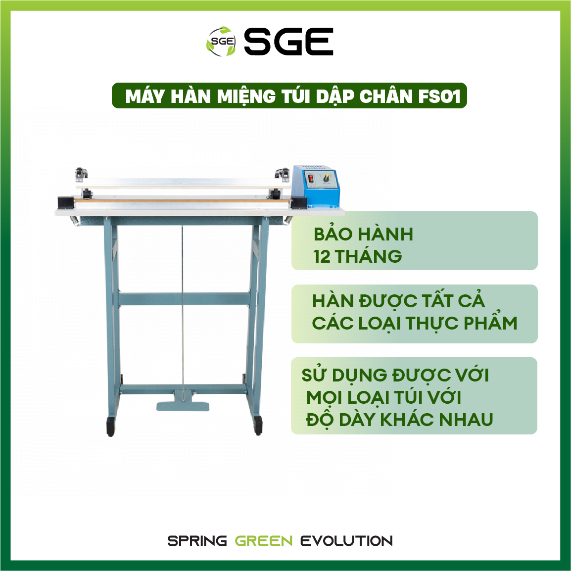 Máy hàn miệng túi dập chân FS01  Máy hàn miệng túi dập chân được thiết kế phù hợp sử dụng trong các dây chuyền sản xuất cần yêu cầu cao về tốc độ. Với nguyên lý hoạt động đơn giản nhưng lại đem lại hiệu quả công việc cao. Dòng mày hàn này thích hợp sử dụng để hàn các loại bao bì đóng gói, giúp sản phẩm có mẫu mã bắt mắt hơn. Tuy nhiên nếu bạn cần tìm một loại máy giúp ích trong việc bảo quản thực phẩm thì chúng tôi khuyên bạn nên tìm hiểu về dòng máy hút chân không. Máy được thiết kế đúng tiêu chuẩn phù hợp với cơ thể giúp người sử dụng có thể thực hiện thao tác thuận tiện và dễ dàng. Hơn nữa, máy còn có thể sử dụng liên tục trong thời gian dài. Ngoài ra, máy còn được lắp đặt hệ thống cầu chì giúp đảm bảo an toàn cho người sử dụng. Thông số kĩ thuật máy ép miệng túi    Máy hàn miệng túi dập chân FS1-40  FS1-60   FS1-80 Nguồn điện 220V 220V 220V Công suất 450W 750W 850W Kích thước máy(LxWxH) 66x30x87 86x30x87 106x30x87 Trọng lượng 14 kg 16 kg 20 kg Tốc độ hàn 0.02-2 giây 0.02-2 giây 0.02-2 giây Độ rộng miệng túi 40 cm 60 cm 80 cm Độ dày dải hàn 3 mm  3 mm 3 mm   Đặc điểm của máy hàn miệng túi