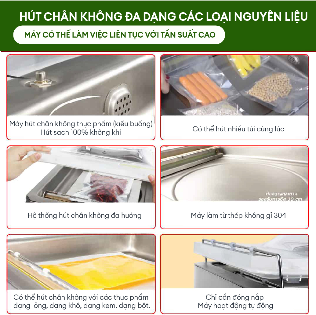 - Có thể hút chân không với các thực phẩm dạng lỏng, dạng khô, dạng kem, dạng bột.
