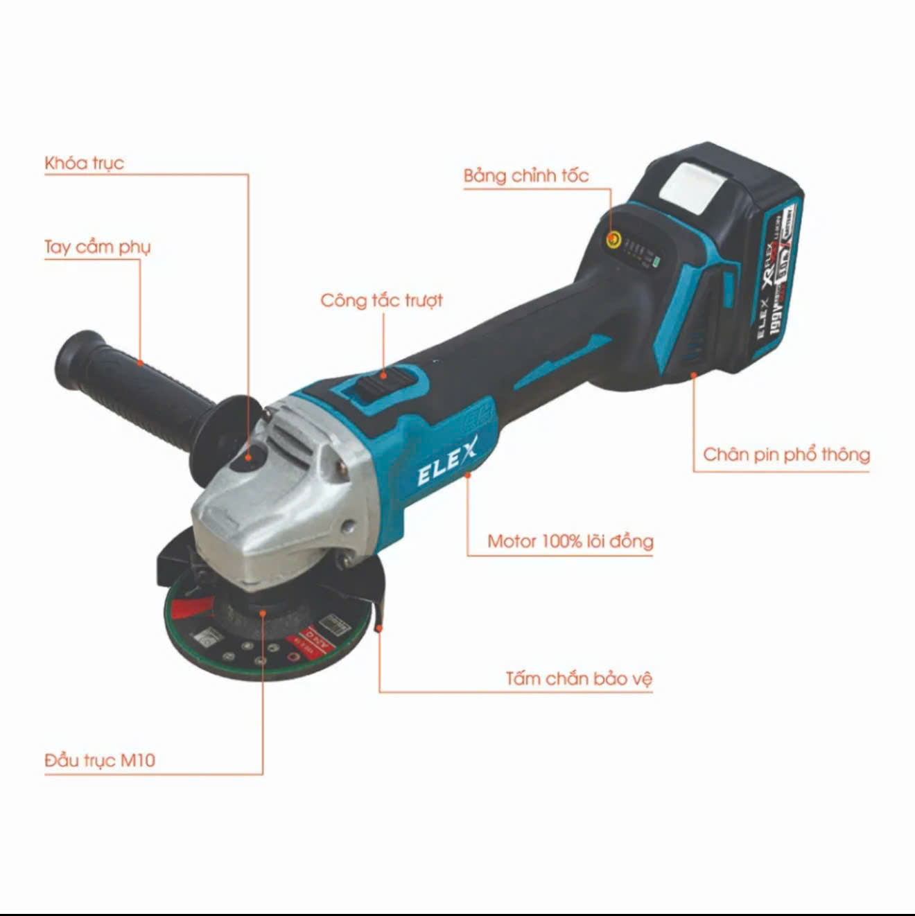 Máy mài pin ,Máy mài góc, Máy Cắt pin ELEX đùng Pin 10cell Boshun Động cơ không chổi than siêu bền, Có điều chỉnh tốc độ - Chức năng: mài góc, cắt sắt, cắt gỗ,