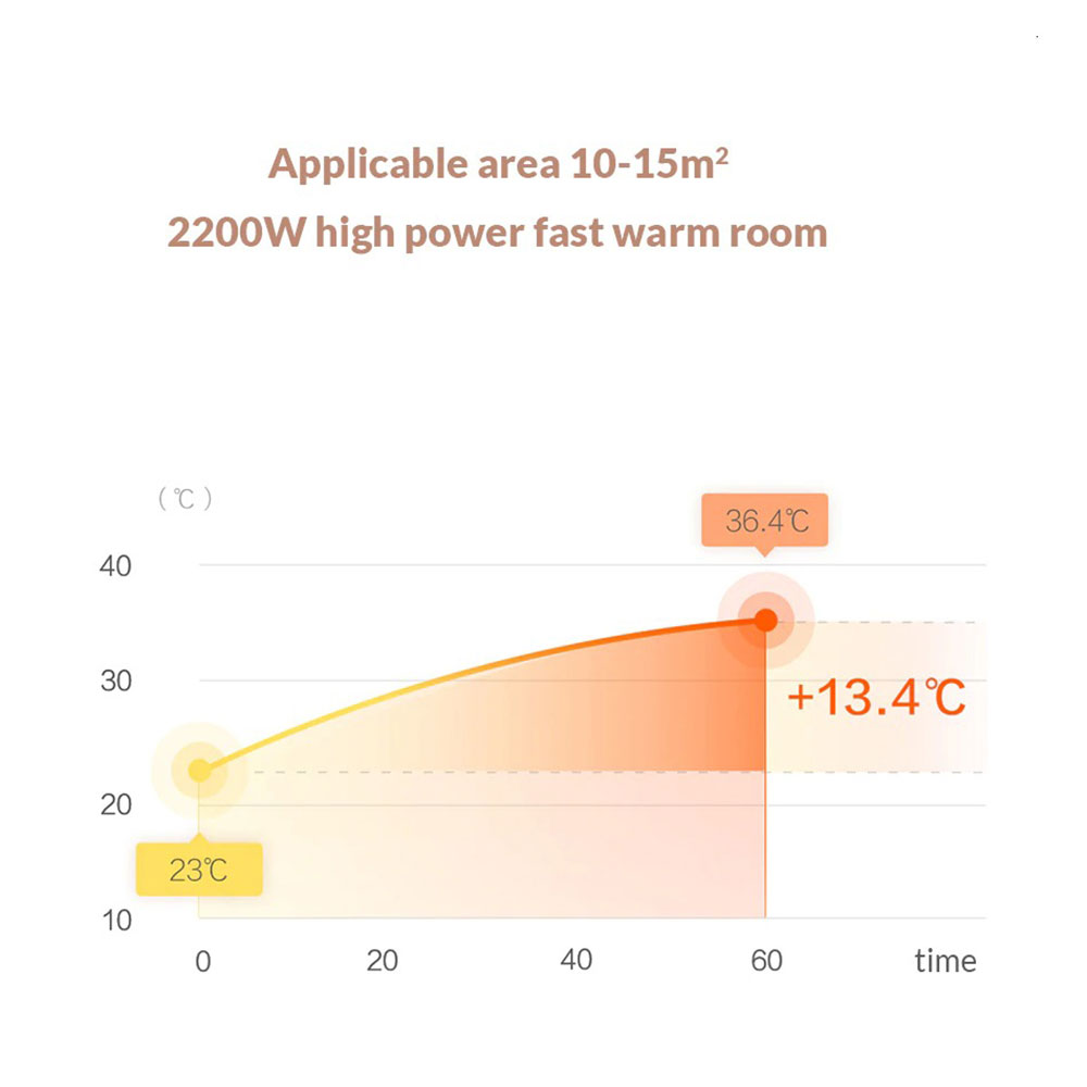 Lò sưởi nóng lên tới 120 độ chỉ trong 72s. Điều này giúp máy sưởi tăng nhiệt độ một cách nhanh chóng. Để dễ dàng sưởi ấm căn phòng và tăng nhiệt độ không khí đáng kể, cung cấp 2 chế độ sưởi khác nhau. Ở chế độ tiết kiệm năng lượng, công suất nóng là 1000 watt, chế độ cao là 2000 watt.