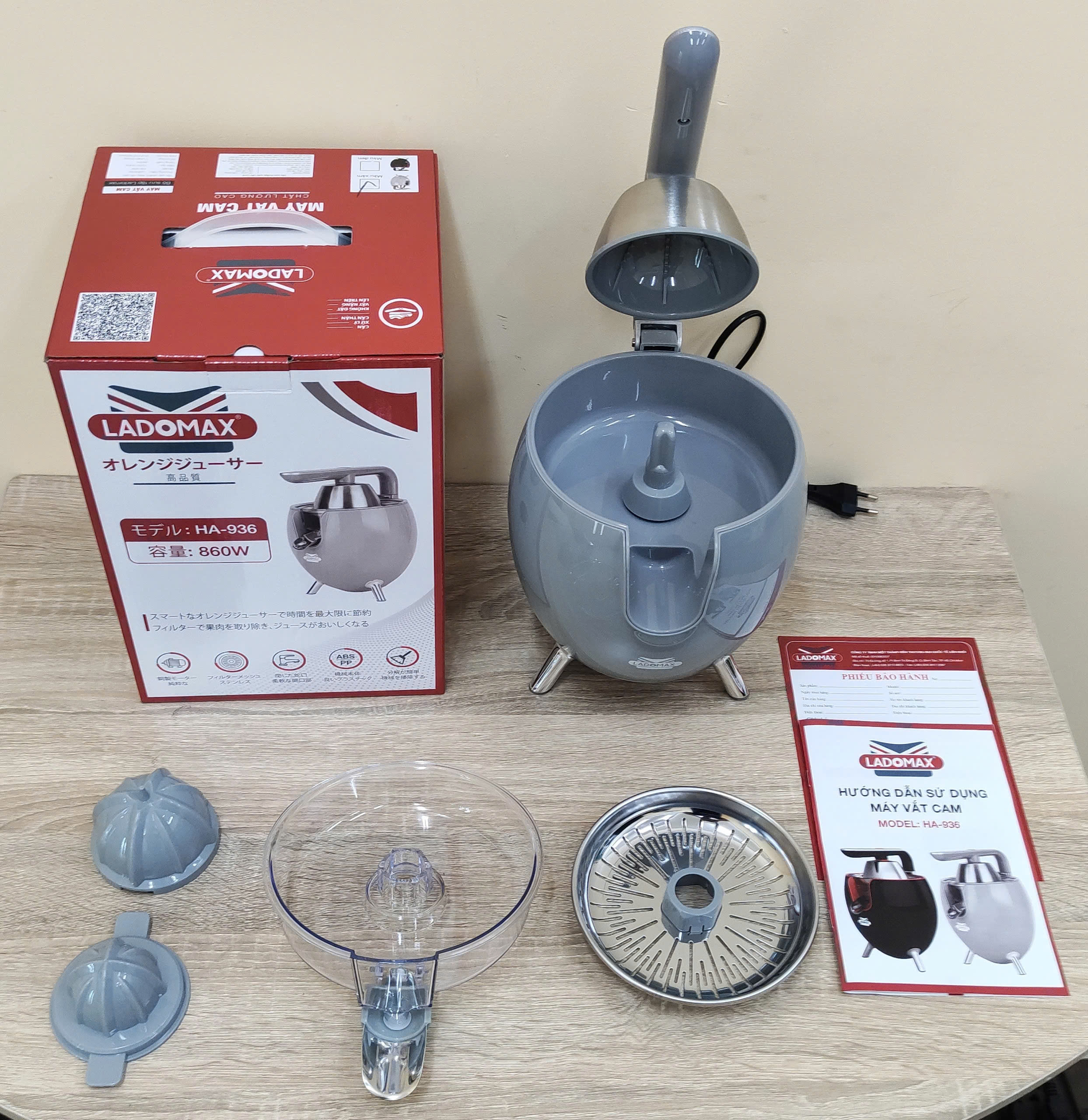 Thông tin sản phẩm Thương hiệu: Ladomax Máy: Máy vắt cam, vắt chanh Công suât: 860W Model :HA936 Núm: 2 đầu nấm lớn nhỏ Khay lọc: Inox Điện áp: 220-240V, 50/60HZ Bảo hành 12 tháng