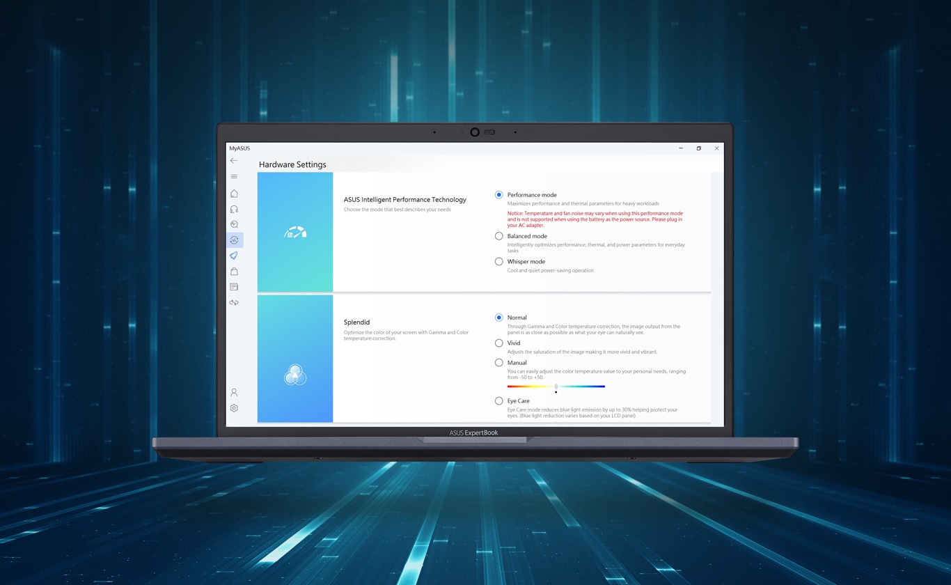 Sức mạnh từ hiệu năng đỉnh cao Công nghệ Hiệu năng Thông minh của ASUS nằm ở thiết kế tản nhiệt siêu hiệu quả và giải pháp tiết kiệm điện năng. Công nghệ sử dụng các thuật toán độc quyền của ASUS kết hợp với năm4 cảm biến thông minh, thiết kế khí động học và bộ nguồn lên tới 90-watt (tùy chọn thêm) nhằm tăng cường hiệu năng CPU một cách thông minh với độ ổn định được cải thiện, tạo nên một chiếc máy tính xách tay mát mẻ và bớt ồn hơn. Với công nghệ Hiệu năng Thông minh của ASUS, ExpertBook B1 sẽ mang lại hiệu năng tối đa theo nhu cầu sử dụng của bạn.