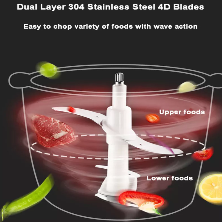 - Trục lưỡi dao bằng nhựa với 4 lưỡi dao đơn xếp 2 tầng, rất sắc giúp xay nhuyễn theo nhu cầu. Vận hành đơn giản, dễ dàng xay nhuyễn thực phẩm