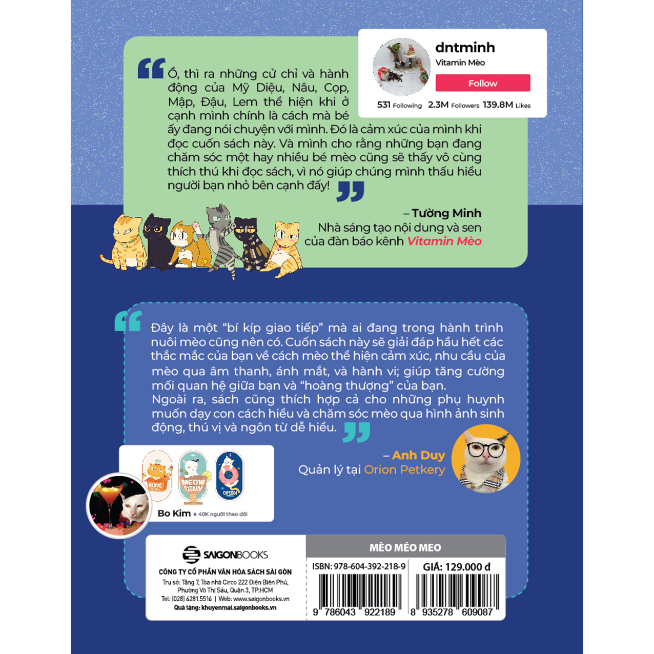 Dù bạn là một người mới nuôi mèo hay đã là một "sen" có kinh nghiệm, Mèo méo meo chắc chắn sẽ mang đến cho bạn những giây phút vừa vui nhộn vừa đầy cảm xúc khi khám phá từng ngóc ngách trong thế giới nội tâm bí ẩn của loài mèo. Cuốn sách này trở thành cẩm nang không thể thiếu cho hội yêu mèo, giúp bạn từ một "con sen nghiệp dư” trở thành "chuyên gia đọc vị" mèo chính hiệu!