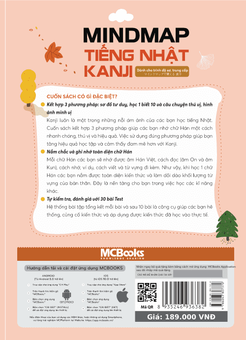 "Mindmap Kanji tiếng Nhật – Dành cho trình độ sơ, trung cấp - Học kèm app" là cuốn sách giúp bạn dễ dàng ghi nhớ bằng 3 phương pháp sơ đồ tư duy, học 1 biết 10, học qua câu chuyện thú vị và hình ảnh minh họa để có thể nắm vững toàn diễn chữ Hán cơ bản trình độ Sơ, trung cấp.