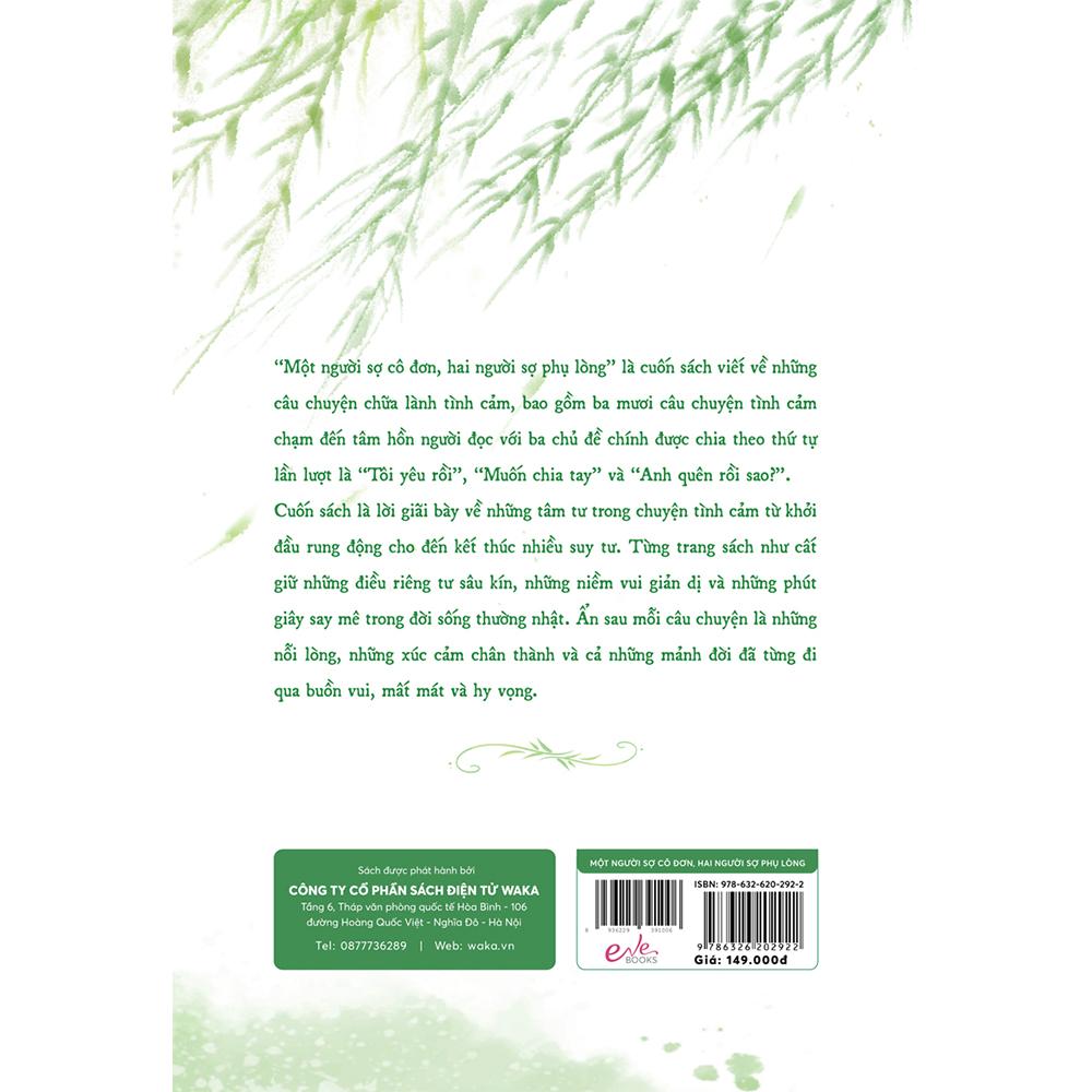“Một người sợ cô đơn, hai người sợ phụ lòng” là cuốn sách viết về những câu chuyện chữa lành tình cảm, bao gồm ba mươi câu chuyện tình cảm chạm đến tâm hồn người đọc với ba chủ đề chính được chia theo thứ tự lần lượt là “Tôi yêu rồi”, “Muốn chia tay” và “Anh quên rồi sao?”.