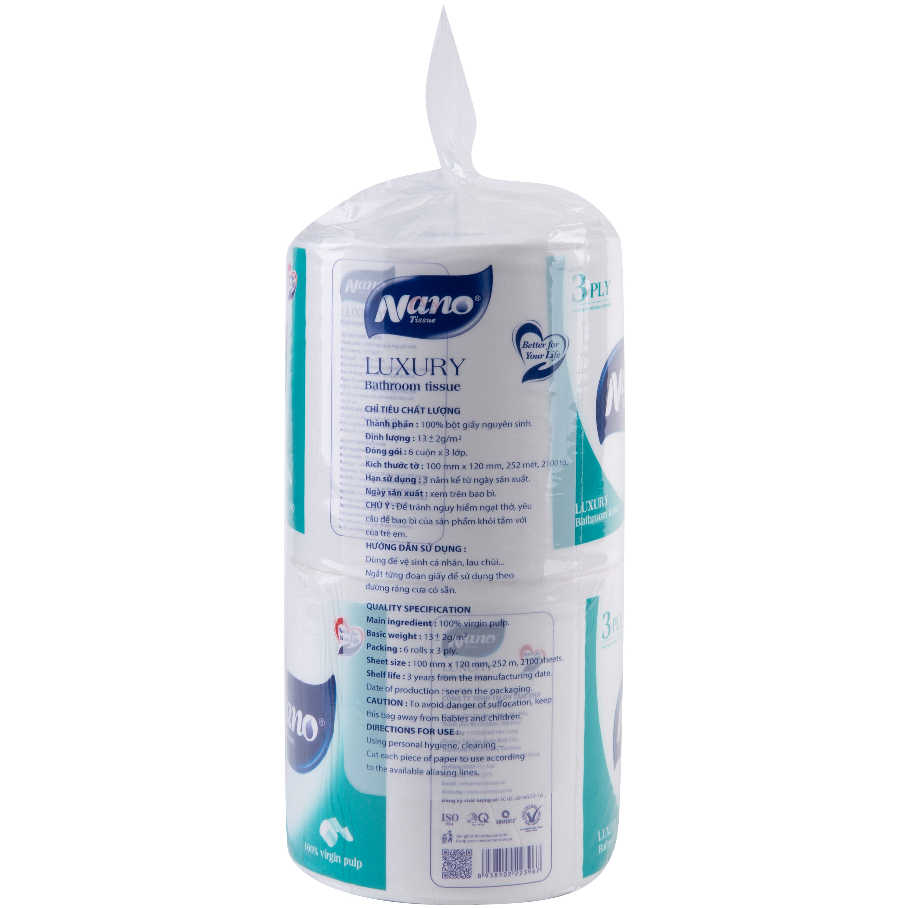 Giấy Vệ Sinh cao cấp Nano (6 Cuộn x 3 Lớp) là sản phẩm giấy chất lượng có xuất xứ từ Indonesia, được làm bằng 100 % bột giấy nguyên sinh, không chứa các hóa chất độc hại, không gây kích ứng da, đảm bảo an toàn tuyệt đối cho người dùng.