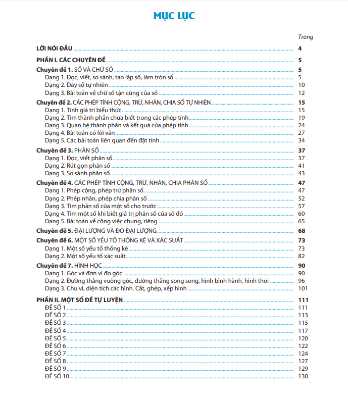 Phần này gồm 10 đề tự luyện, mỗi đề được chia thành hai phần chính: Trắc nghiệm khách quan và Tự luận. Các đề tự luyện có nội dung phủ khắp chương trình Toán lớp 4, có độ phân hoá từ mức độ cơ bản đến nâng cao, phù hợp cho các em rèn luyện trước khi làm các bài kiểm tra, đánh giá thường xuyên hoặc trước các kì thi học sinh giỏi,