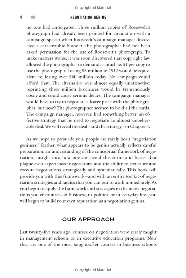 From two leaders in executive education at Harvard Business School, here are the mental habits and proven strategies you need to achieve outstanding results in any negotiation. Whether you’ve “seen it all” or are just starting out, Negotiation Genius will dramatically improve your negotiating skills and confidence. Drawing on decades of behavioral research plus the experience of thousands of business clients, the authors take the mystery out of preparing for and executing negotiations—whether they involve multimillion-dollar deals or improving your next salary offer. What sets negotiation geniuses apart? They are the men and women who know how to: - Identify negotiation opportunities where others see no room for discussion - Discover the truth even when the other side wants to conceal it - Negotiate successfully from a position of weakness - Defuse threats, ultimatums, lies, and other hardball tactics - Overcome resistance and “sell” proposals using proven influence tactics - Negotiate ethically and create trusting relationships—along with great deals - Recognize when the best move is to walk away - And much, much more This book gets “down and dirty.” It gives you detailed strategies—including talking points—that work in the real world even when the other side is hostile, unethical, or more powerful. When you finish it, you will already have an action plan for your next negotiation. You will know what to do and why. You will also begin building your own reputation as a negotiation genius .