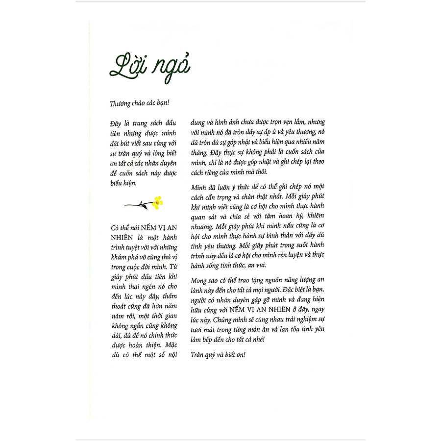 Mong sao có thể trao tặng nguồn năng lượng an lành này đến cho tất cả mọi người. Đặc biệt là bạn, người có nhân duyên gặp gỡ mình và đang hiện hữu cùng với NẾM VỊ AN NHIÊN ở đây, ngay lúc này. Chúng mình sẽ cùng nhau trải nghiệm sự tươi mát trong từng món ăn và lan tỏa tình yêu làm bếp đến cho tất cả nhé!”