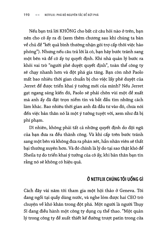 Hastings đặt ra những tiêu chuẩn mới, xem trọng con người hơn quy trình, nhấn mạnh đổi mới hơn hiệu quả, và trao cho nhân viên bối cảnh thay vì kiểm soát họ. Netflix không có chính sách ngày phép hay quy định công tác phí. Tại Netflix, người có kết quả làm việc bình thường nhận được gói trợ cấp thôi việc hào phóng, và làm việc chăm chỉ là không cần thiết. Tại Netflix, bạn không cần cố gắng làm hài lòng cấp trên, bạn phải đưa ra phản hồi trung thực.