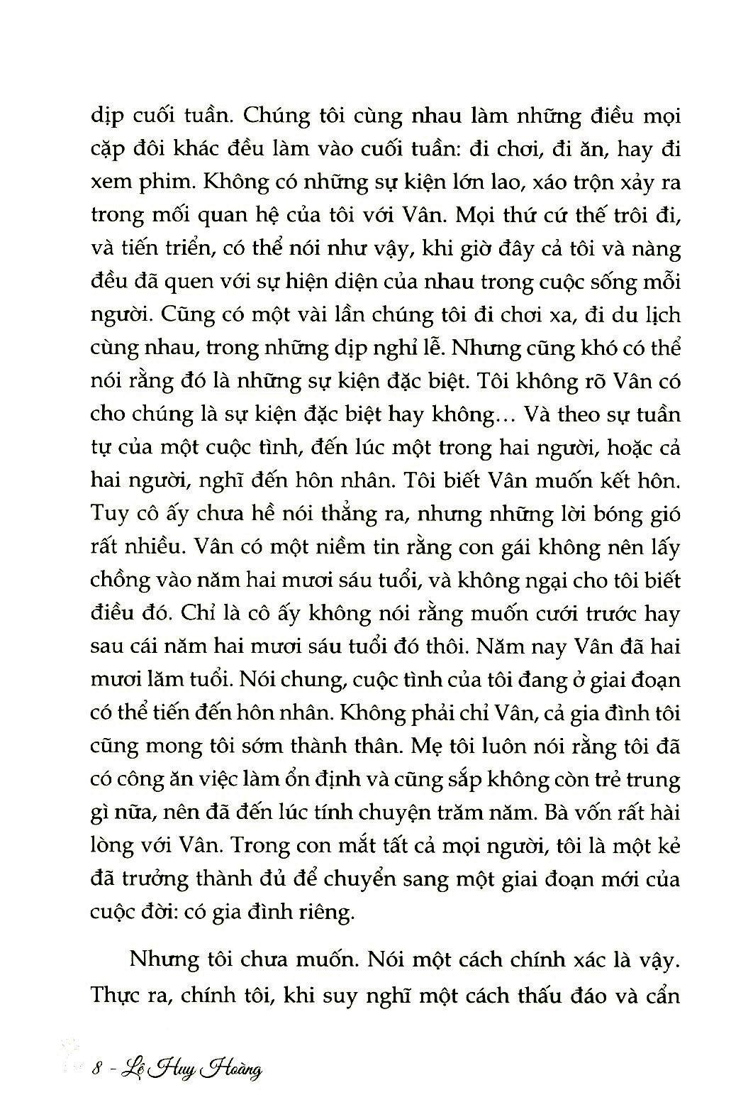 Bản thân tôi cảm thấy như vậy. Chúng tôi đều là những con người bận rộn, và chỉ có thể dành thời gian cho nhau vào dịp cuối tuần. Chúng tôi cùng nhau làm những điều mọi cặp đôi khác đều làm vào cuối tuần: đi chơi, đi ăn, hay đi xem phim. Không có những sự kiện lớn lao, xáo trộn xảy ra trong mối quan hệ của tôi với Vân. Mọi thứ cứ thế trôi đi, và tiến triển, có thể nói như vậy, khi giờ đây cả tôi và nàng đều đã quen với sự hiện diện của nhau trong cuộc sống mỗi người. Cũng có một vài lần chúng tôi đi chơi xa, đi du lịch cùng nhau, trong những dịp nghỉ lễ. Nhưng cũng khó có thể nói rằng đó là những sự kiện đặc biệt. Tôi không rõ Vân có cho chúng là sự kiện đặc biệt hay khô Và theo sự tuần tự của một cuộc tình, đến lúc một trong hai người, hoặc cả hai người, nghĩ đến hôn nhân. Tôi biết Vân muốn kết hôn. Tuy cô ấy chưa hề nói thẳng ra, nhưng những lời bóng gió rất nhiều. Vân có một niềm tin rằng con gái không nên lấy chồng vào năm hai mươi sáu tuổi, và không ngại cho tôi biết điều đó. Chỉ là cô ấy không nói rằng muốn cưới trước hay sau cái năm hai mươi sáu tuổi đó thôi. Năm nay Vân đã hai mươi lăm tuổi. Nói chung, cuộc tình của tôi đang ở giai đoạn có thể tiến đến hôn nhân. Không phải chỉ Vân, cả gia đình tôi cũng mong tôi sớm thành thân. Mẹ tôi luôn nói rằng tôi đã có công ăn việc làm ổn định và cũng sắp không còn trẻ trung gì nữa, nên đã đến lúc tính chuyện trăm năm. Bà vốn rất hài lòng với Vân. Trong con mắt tất cả mọi người, tôi là một kẻ đã trưởng thành đủ để chuyển sang một giai đoạn mới của cuộc đời: có gia đình riêng.