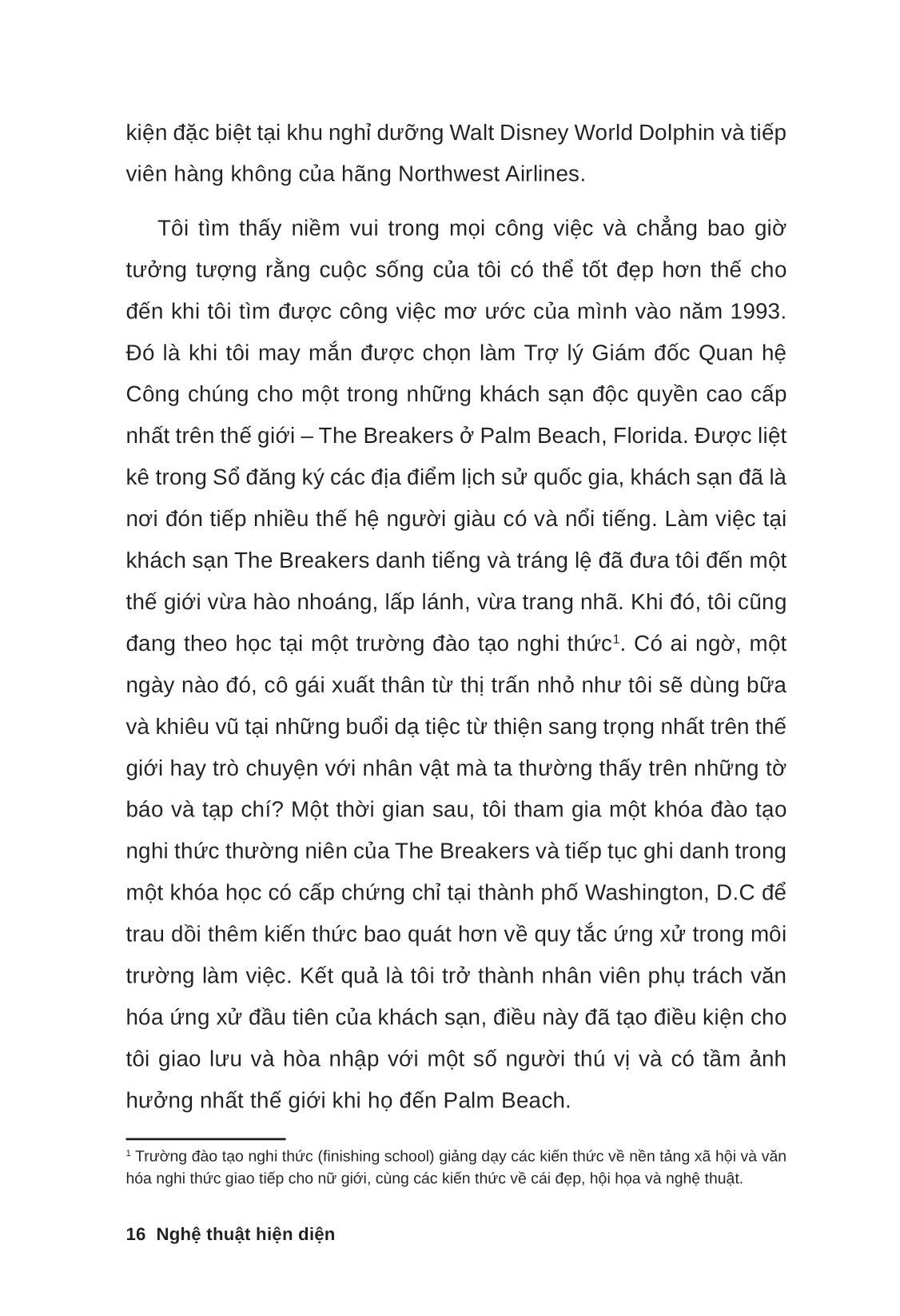 Nghệ Thuật Hiện Diện Làm thế nào để chúng ta nổi bật trong thị trường việc làm cạnh tranh hiện tại khi có rất nhiều người thông minh, có năng lực ngoài kia? Câu trả lời nằm trong “Nghệ thuật hiện diện” - một cuốn sách được viết bởi nhà sáng lập trường đào tạo kỹ năng Palm Beach Jacqueline Whitmore - người chuyên cung cấp các chương trình đào tạo về ứng xử dành cho các doanh nghiệp lớn trên thế giới. Qua từng trang sách, Jacqueline sẽ chỉ cho bạn cách tiến gần hơn mục tiêu mà m.ình mong muốn thông qua bốn bước: Thay đổi diện mạo - Tạo dấu ấn - Xây thương hiệu và Khẳng định vị thế, với các bài viết thực hành giúp tạo nên dấu ấn cá nhân như: xây dựng tủ đồ thông minh, giao tiếp ứng xử khéo léo, phát triển mạng lưới quan hệ và phong thái làm việc chuyên nghiệp. Qua đó, bạn không chỉ nâng cao giá trị bản thân mà còn có thể tận dụng chính sự độc đáo của m.ình để mang lại sự hữu ích cho công ty, khách hàng và môi trường xung quanh nói chung. Và đừng quên: “Nhiều hơn vẻ bề ngoài hào nhoáng có thể ngụy tạo, sự hiện diện dù trong thinh lặng vẫn có sức nặng hơn những lời nói ồn ào nhưng trống rỗng.” Về tác giả Jacqueline Whitmore là nhà sáng lập Trường đào tạo kỹ năng Palm Beach, cung cấp các chương trình đào tạo về giao tiếp, lãnh đạo và huấn luyện điều hành cho các tập đoàn lớn trên thế giới.