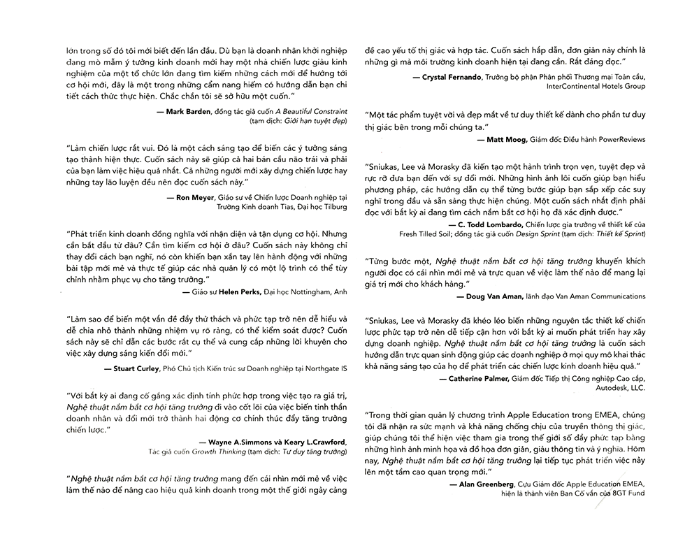 Khám phá và đầu tư vào những cơ hội tăng trưởng chưa bao giờ là bài toán dễ giải, đặc biệt là với các tổ chức đã hoạt động ổn định, bị bó hẹp trong lối tư duy lỗi thời hoặc các mô hình kinh doanh truyền thống. Nghệ thuật nắm bắt cơ hội tăng trưởng sẽ cung cấp cho bạn một lộ trình ngắn nhất để nhận diện, thiết kế và ra mắt các sáng kiến tăng trưởng chiến lược. Marc, Parker và Matt đã xây dựng một hành trình hấp dẫn, nội dung phong phú dành cho bất kỳ ai theo đuổi mục tiêu tăng trưởng mới. Và trong quá trình giới thiệu những cách tư duy mới về chiến lược tăng trưởng và đổi mới chiến lược, ví dụ như nội dung về nhóm phi khách hàng, bản chất nhu cầu của khách hàng cùng các thành tố tạo nên mô hình kinh doanh và mô hình doanh thu, họ cũng giới thiệu với chúng ta những cách làm việc mới. Phương pháp tư duy thị giác và các nguyên tắc tư duy thiết kế kinh doanh khác được thể hiện xuyên suốt cuốn sách sẽ giúp bạn cải thiện cách tiếp cận vấn đề thiết kế và thực hiện chiến lược để phát triển hoạt động kinh doanh tăng trưởng mới. Với sự hỗ trợ của hình ảnh, các công cụ và biểu mẫu, bạn sẽ áp dụng phương pháp này theo đúng nhu cầu của mình. Cuốn sách chia làm 5 chương, giúp từng bước hiểu và xây dựng được cho mình một chiến lược tăng trưởng kiểu mới: Chương 1: Giúp bạn hiểu Chiến lược đổi mới là gì đặt trong sự đối sánh với chiến lược kiểu truyền thống; và 5 nguyên tắc quan trọng của tư duy thiết kế kinh doanh. Đây là những câu hỏi căn bản để bạn thực sự bước chân vào lãnh địa đổi mới chiến lược. Chương 2: Giúp bạn khám phá các cơ hội tăng trưởng kiểu mới bằng việc hiểu rõ nhóm khách hàng và phi khách hàng. Điều quan trọng không kém là hiểu về chính doanh nghiệp của bạn. Từ đó xây dựng khung làm việc cho các sáng kiến và cơ hội tăng trưởng kiểu mới. Chương 3 : Giúp bạn bắt tay vào thiết kế bản chiến lược. Cụ thể là thiết kế chính sản phẩm mà bạn chào bán, xác định mô hình kinh doanh và mô hình doanh thu cho doanh nghiệp mình. Từ đó xác lập chiến lược tăng trưởng cụ thể bằng cách tạo giá trị cho khách hàng, doanh nghiệp và hệ sinh thái. Thể hiện chiến lược dưới dạng hình ảnh cũng là một nghệ thuật cần được quan tâm. Chương 4 : Đi sâu vào 3 giai đoạn thử nghiệm và ra mắt hoạt động kinh doanh tăng trưởng, bao gồm : khởi đầu, phát triển và mở rộng. Chương 5 : Giúp bạn làm chủ nghệ thuật nắm bắt cơ hội tăng trưởng bằng tư duy thiết kế kinh doanh. 5 nguyên tắc của tư duy thiết kế kinh doanh sẽ được làm rõ bằng các dẫn chứng và ví dụ minh họa. Mỗi chương đều có phần hoạt động dành cho các nhóm trong doanh nghiệp để thực hành lý thuyết. Kèm với đó là các doanh nghiệp truyền cảm hứng như Microsoft, Oracle, ProSiebenSat.1, Fahrenheit 212, Câu chuyện của họ thực sự là những bài học hữu ích cho các doanh nghiệp đang cố gắng đổi mới chiến lược tăng trưởng .