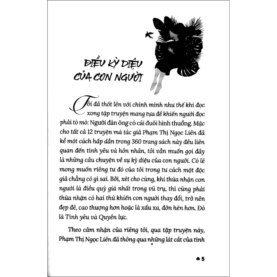 360 trang sách "Người đàn ông có cái đuôi hình thuổng" đều liên quan đến tình yêu và hôn nhân. Qua tập truyện này, Phạm Thị Ngọc Liên đã thông qua những lát cắt của tình yêu và hôn nhân mà phơi bày - tuy chắc chắn chưa là tận cùng - những tình cảm cao cả, những ham muốn trần tục quái dị thậm chí xấu xa, vô vàn những tâm trạng u uẩn tột độ của con người như đau khổ, nhớ nhung, cô đơn, sợ hãi, hoang mang và cả sự ác độc nữ --- Nhà báo Nguyễn Thế Thanh