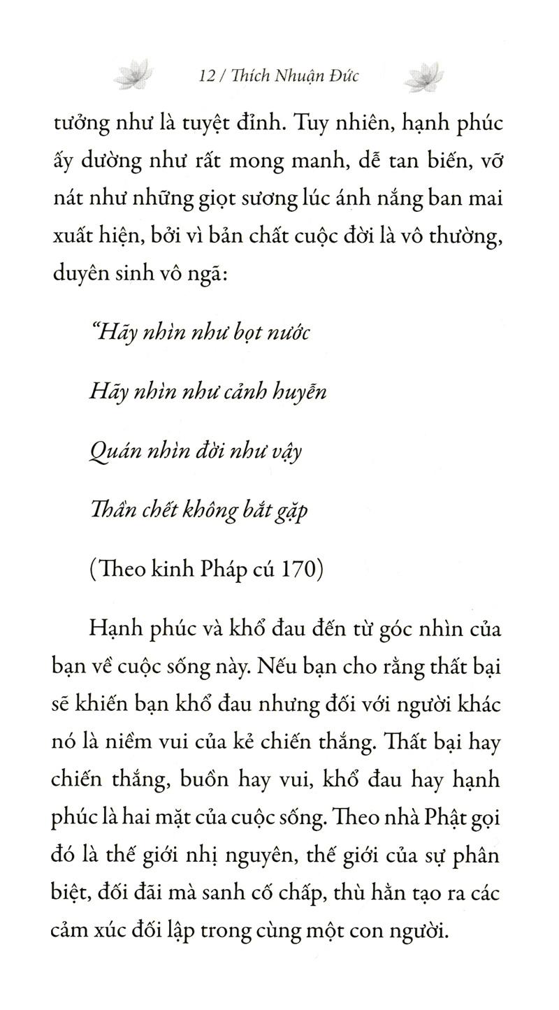 Hạnh phúc và khổ đau đến từ góc nhìn của bạn về cuộc sống này. Nếu bạn cho rằng thất bại sẽ khiến bạn khổ đau nhưng đối với người khác nó là niềm vui của kẻ chiến thắng. Thất bại hay chiến thắng, buồn hay vui, khổ đau hay hạnh phúc là hai mặt của cuộc sống. Theo nhà Phật gọi đó là thế giới nhị nguyên, thế giới của sự phân biệt, đối đãi mà sanh cố chấp, thù hằn tạo ra các cảm xúc đối lập trong cùng một con người.