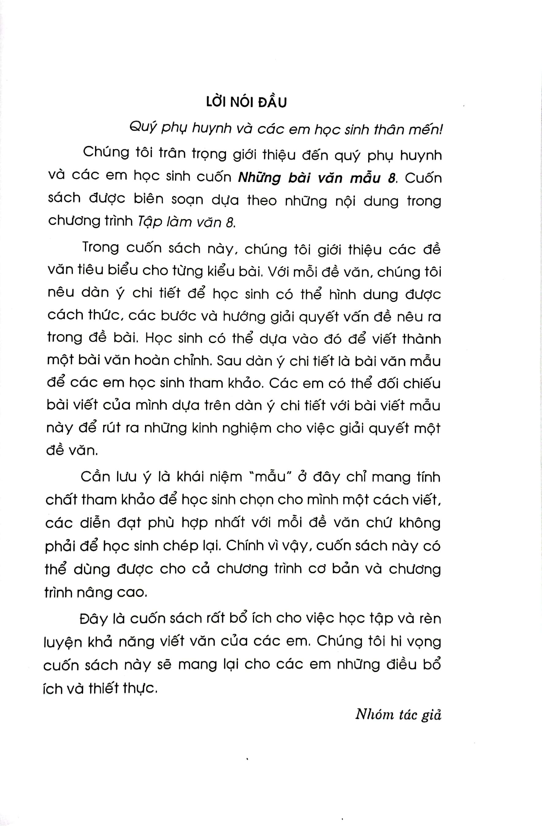 Những Bài Văn Mẫu 8 Cuốn sách tuyển chọn và giới thiệu đến các em những bài văn mẫu hay. Nội dung sách gồm bám sát chương trình Ngữ văn lớp 8 hiện hành. Các bài văn đa dạng về thể loại và nội dung. Ngoài ra, quý bậc phụ huynh, thầy cô cũng có thể giúp con em m.ình trong quá trình học tập ở trường lớp.