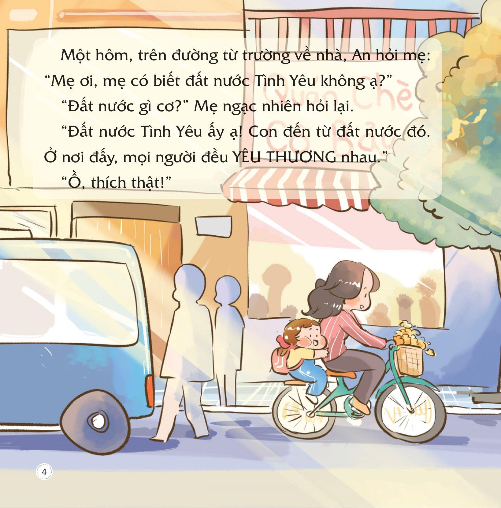 Bé An luôn tưởng tượng rằng có một đất nước tình yêu tồn tại trên đời. Ở đất nước đó, đèn giao thông có hình trái tim, ngôi nhà cũng có hình trái tim. Ở đất nước đó, không có mưa gió hay lũ lụt mà luôn ấm áp, ông mặt trời luôn mỉm cười. Nhưng tại sao đất nước tình yêu hoàn hảo như thế, An lại chọn đến đây nhỉ? Thì An thủ thỉ với mẹ rằng “Vì mẹ là Tình Yêu của con ạ”.