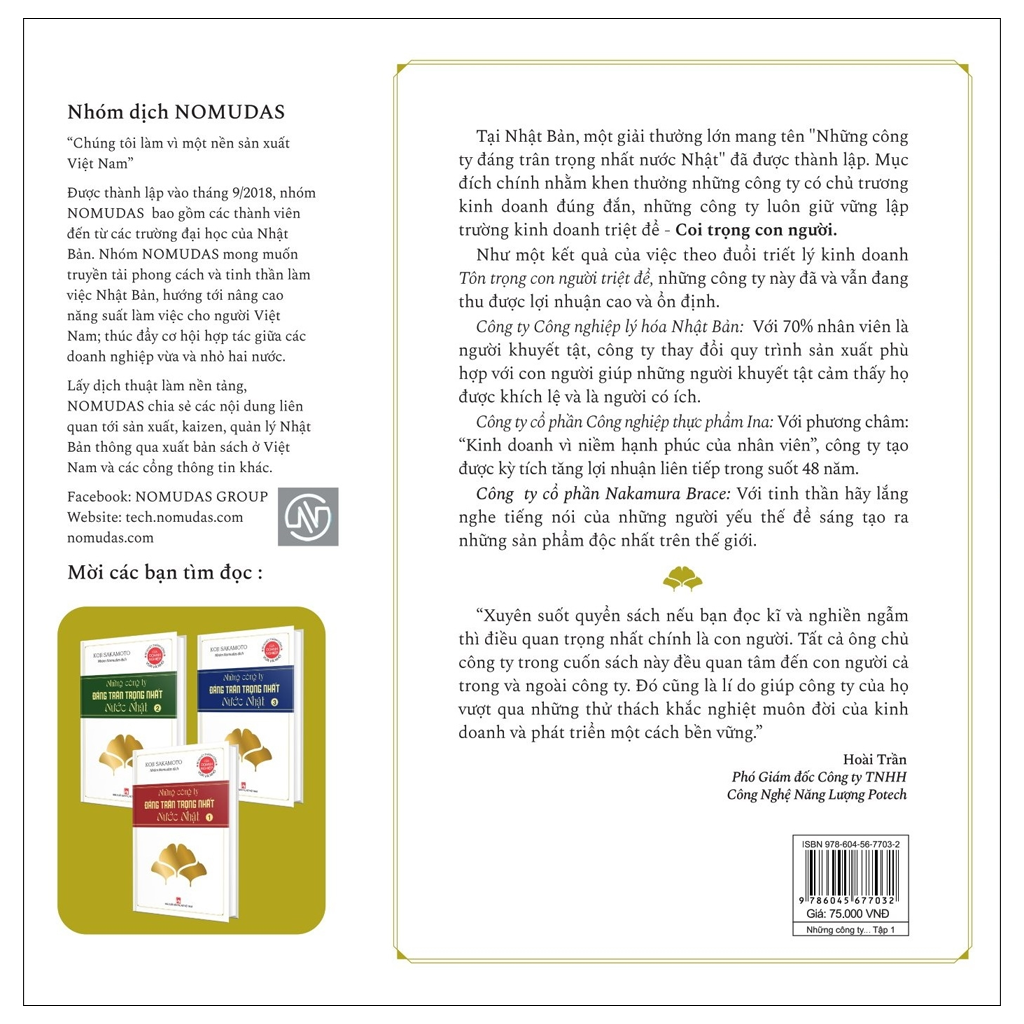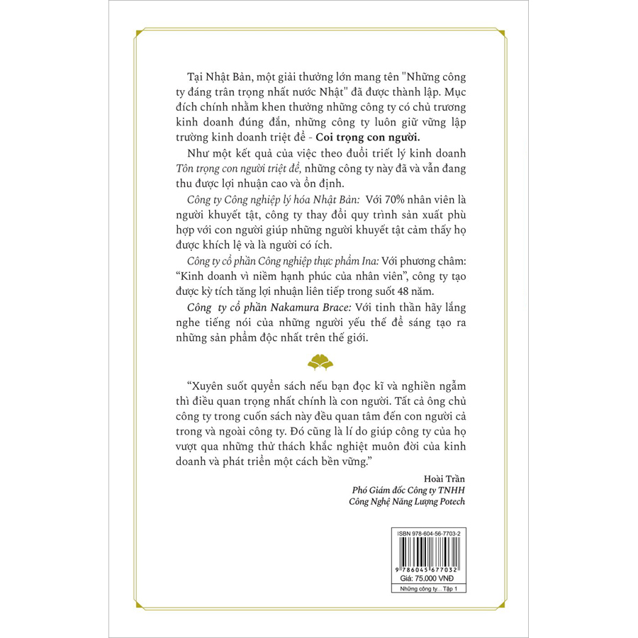 “Những công ty đáng trân trọng nhất nước Nhật – Tập 1”, được chia làm 2 phần: Phần 1 sẽ viết về trách nhiệm, sứ mệnh của một nhà kinh doanh với "năm loại người" và phần 2 viết kĩ về 5 công ty có đường lối kinh doanh và lý do họ đáng được trân trọng:
