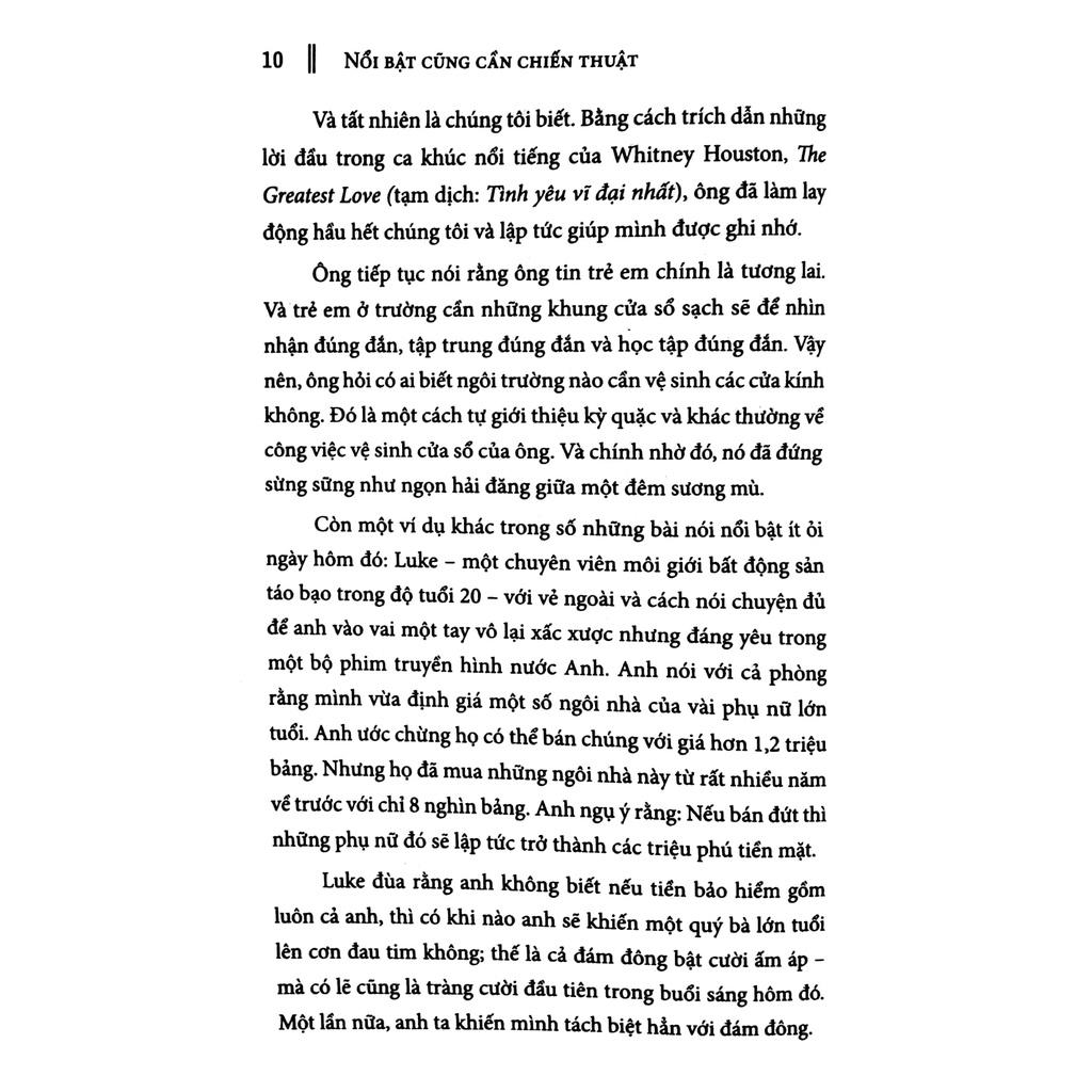 Dựa trên nghiên cứu chuyên sâu và những ví dụ thực tế đầy cảm hứng, nhà tâm lý học kiêm tác giả sách bán chạy, Tiến sĩ Rob Yeung, sẽ hướng dẫn bạn những bí quyết để được mọi người chú ý vì lý do chính đáng. Nổi bật cũng cần chiến thuật sẽ giúp bạn: vận dụng thành công ngôn ngữ cơ thể; kết hợp những câu từ khiến mọi người phải gật đầu đồng tình trong lời nói hằng ngày; trau dồi kỹ năng thuyết phục để bán sản phẩm, nêu ý tưởng, lập mạng lưới quan hệ và giao lưu với bạn bè; tạo động lực thúc đẩy để trở nên thành công hơn; nâng cao lòng tự tin để đạt được thành quả như mong muốn.