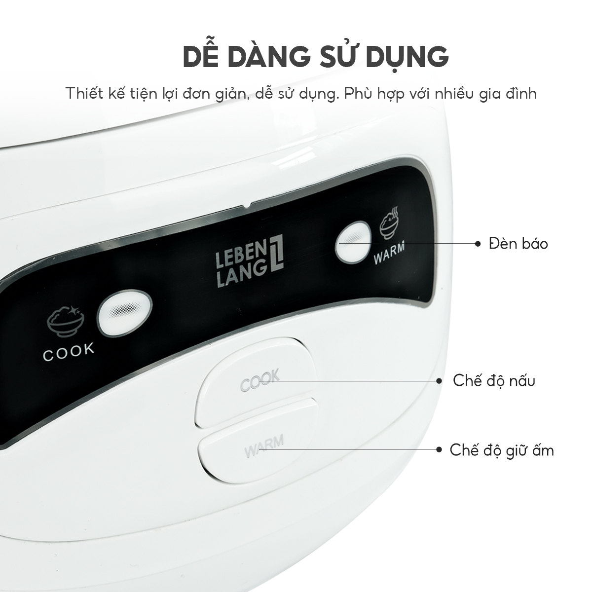 - Hệ Thống Điều Khiển Đơn Giản: Nồi cơm tiện lợi Lebenlang vận hành dễ dàng chỉ với hai nút bấm, thích hợp cho mọi lứa tuổi.