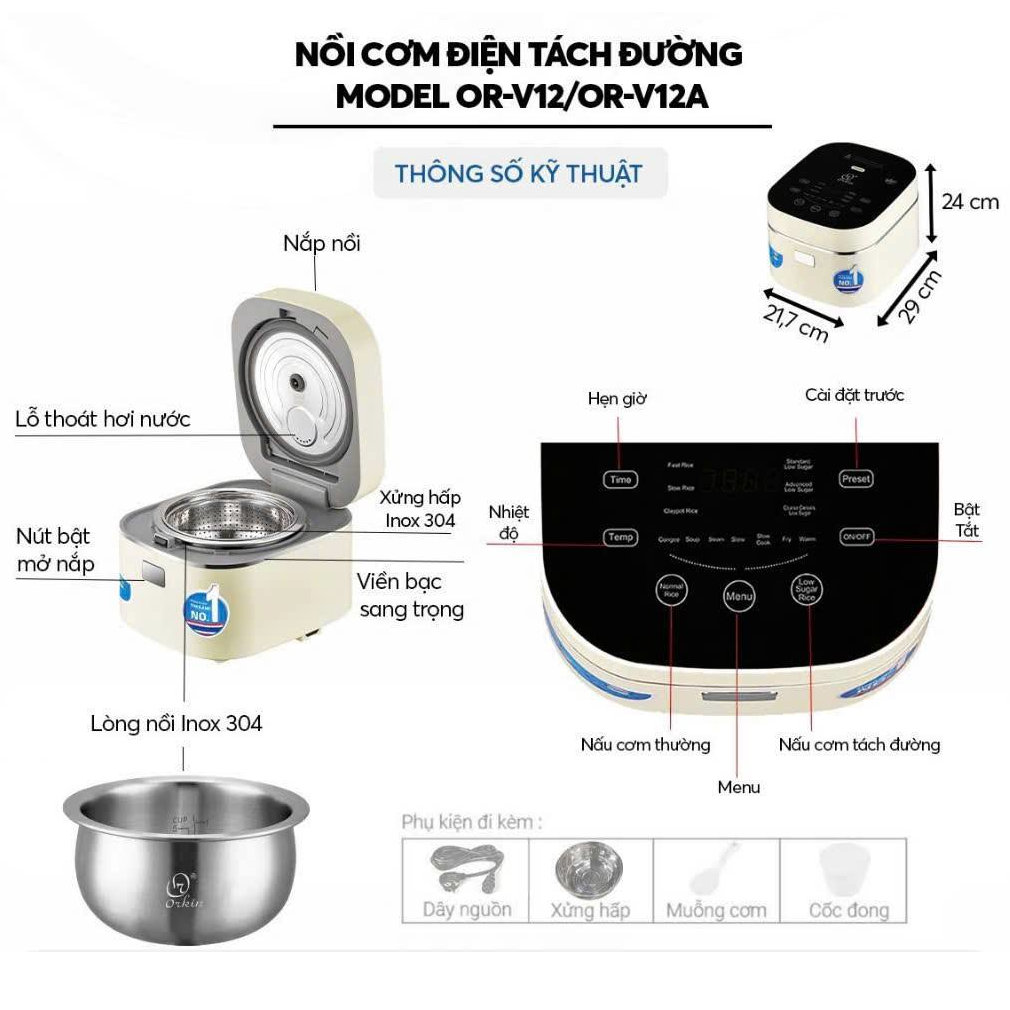 - Nồi cơm điện tử tách đường ORKIN OR-V12 không chỉ là một thiết bị nấu ăn tiện lợi mà còn là người bạn đồng hành đắc lực giúp bạn chăm sóc sức khỏe gia đình.