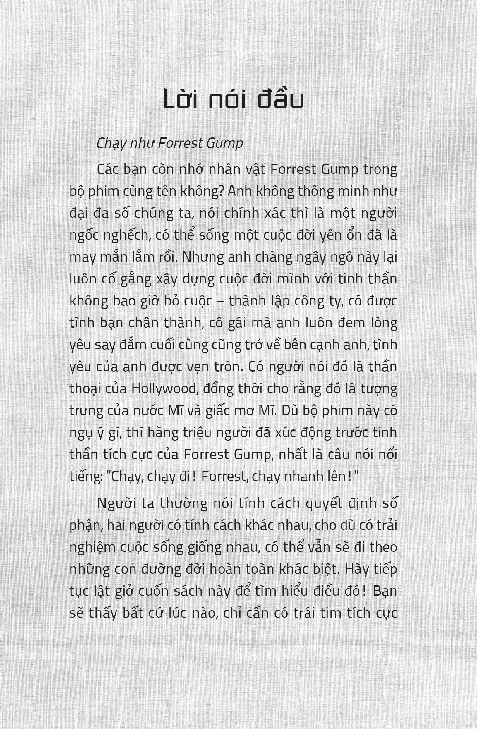 Các bạn còn nhớ nhân vật Forrest Gump trong bộ phim cùng tên không? Anh không thông minh như đại đa số chúng ta, nói chính xác thì là một người ngốc nghếch, có thể sống một cuộc đời yên ổn đã là may mắn lắm rồi. Nhưng anh chàng ngây ngô này lại luôn cố gắng xây dựng cuộc đời mình với tinh thần không bao giờ bỏ cuộc – thành lập công ty, có được tình bạn chân thành, cô gái mà anh luôn đem lòng yêu say đắm cuối cùng cũng trở về bên cạnh anh, tình yêu của anh được vẹn tròn. Có người nói đó là thần thoại của Hollywood, đồng thời cho rằng đó là tượng trưng của nước Mĩ và giấc mơ Mĩ. Dù bộ phim này có ngụ ý gì, thì hàng triệu người đã xúc động trước tinh thần tích cực của Forrest Gump, nhất là câu nói nổi tiếng: “Chạy, chạy đi! Forrest, chạy nhanh lên!” Người ta thường nói tính cách quyết định số phận, hai người có tính cách khác nhau, cho dù có trải nghiệm cuộc sống giống nhau, có thể vẫn sẽ đi theo những con đường đời hoàn toàn khác biệt. Hãy tiếp tục lật giở cuốn sách này để tìm hiểu điều đó! Bạn sẽ thấy bất cứ lúc nào, chỉ cần có trái tim tích cực thay đổi hiện trạng, thì mọi điều đều có thể xảy ra.