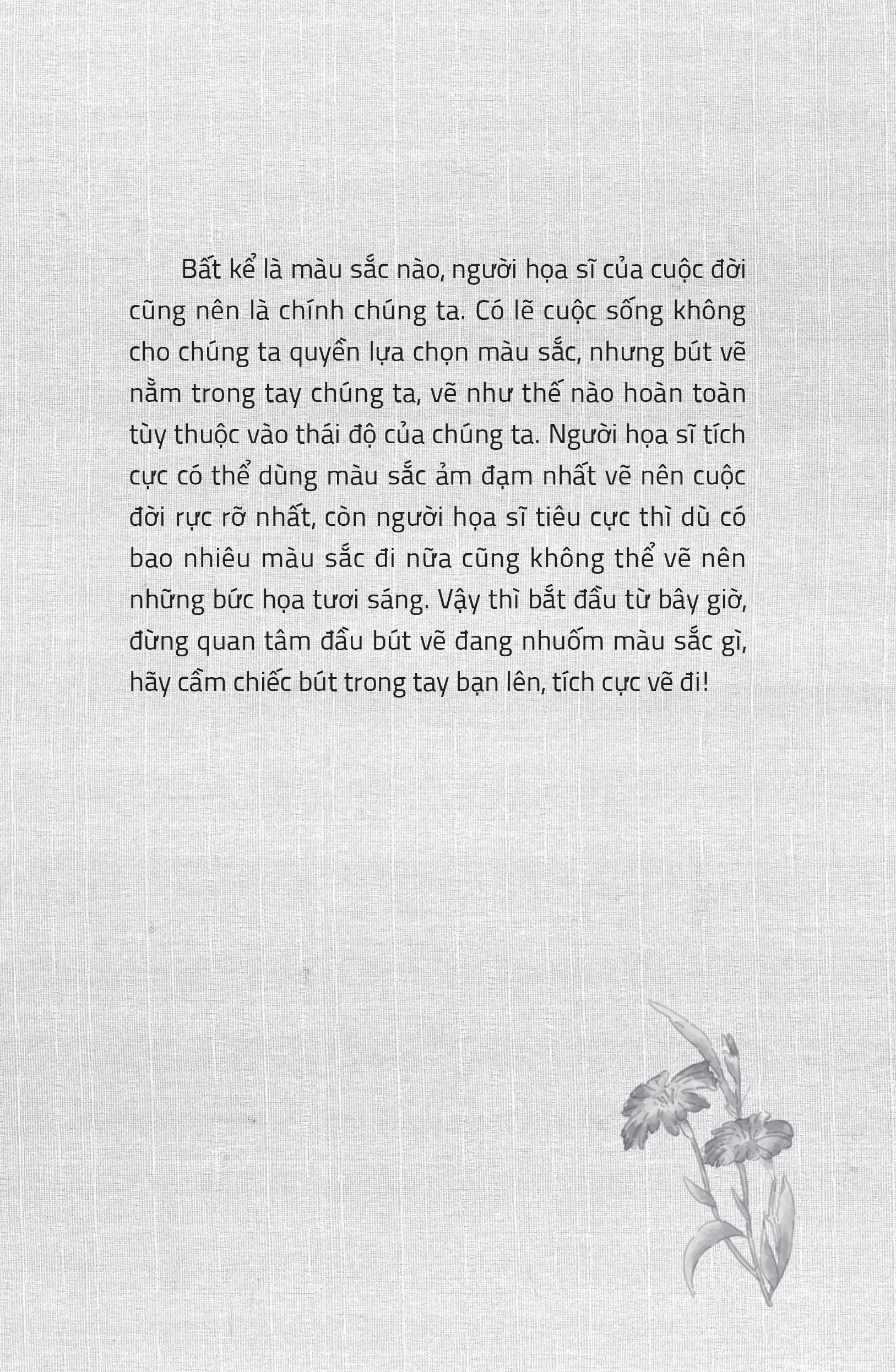 Đứng trước cuộc sống, con người phải là người sáng tạo chủ động, chứ không thể ngồi không mặc cho những nhân tố khác sắp đặt. Cuộc sống luôn tràn đầy niềm vui, nỗi đau, sự đắc chí, nỗi thất vọng. Trong bất cứ trạng thái sinh tồn nào, tinh thần con người đều cần giữ sự lạc quan và tích cực phấn đấu, vì sự tích cực trong hoàn cảnh thuận lợi có thể khiến con người sáng tạo nên đỉnh cao mới, còn trong nghịch cảnh có thể thúc đẩy cơ hội xoay chuyển tình thế tới nhanh hơn. Đời người giống như một cuốn album ảnh rực rỡ sắc màu: kí ức thời thơ ấu là một vùng trắng xóa, nhìn cái gì cũng đều đơn giản và trực tiếp; sự vụng dại của tuổi thiếu niên mang màu xanh lục, tuy non nớt nhưng tràn đầy sức sống; màu sắc của tuổi trưởng thành hoặc là màu vàng lấp lánh hoặc là màu nâu buồn bã, cuộc đời có lúc thành công có lúc thất bại, từ đó trui rèn tâm trí chúng ta; phong cảnh của tuổi già có lẽ là màu lam nhạt cuối chân trời, trông có vẻ hiền hòa như đã gột rửa hết mọi phù hoa náo nhiệt, nhưng lại sâu thẳm như ẩn giấu những điều khó biết. Bất kể là màu sắc nào, người họa sĩ của cuộc đời cũng nên là chính chúng ta. Có lẽ cuộc sống không cho chúng ta quyền lựa chọn màu sắc, nhưng bút vẽ nằm trong tay chúng ta, vẽ như thế nào hoàn toàn tùy thuộc vào thái độ của chúng ta. Người họa sĩ tích cực có thể dùng màu sắc ảm đạm nhất vẽ nên cuộc đời rực rỡ nhất, còn người họa sĩ tiêu cực thì dù có bao nhiêu màu sắc đi nữa cũng không thể vẽ nên những bức họa tươi sáng. Vậy thì bắt đầu từ bây giờ, đừng quan tâm đầu bút vẽ đang nhuốm màu sắc gì, hãy cầm chiếc bút trong tay bạn lên, tích cực vẽ