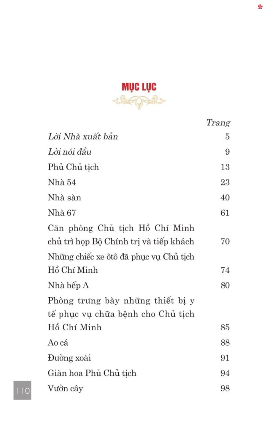Cuốn sách tái hiện một cách chân thực, đưa độc giả đến với từng góc nhỏ, từng kỷ vật, từng câu chuyện giản dị nhưng thấm đẫm ý nghĩa lịch sử và nhân văn về những địa điểm gắn bó với Chủ tịch Hồ Chí Minh tại Khu Phủ Chủ tịch như: Nhà 54, Nhà sàn, Nhà 67, ao cá, vườn xoài, hàng cây...