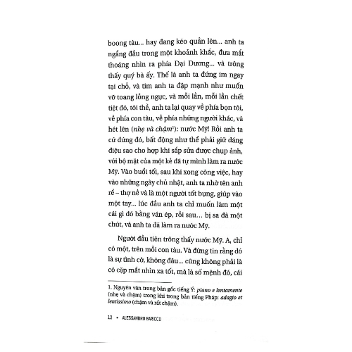 Cô đọng, giàu nhạc tính, thi tính và kịch tính, sự hài hước hòa quyện trong những suy tư triết học, Novecento – Nghệ sĩ dương cầm trên đại dương (Nguyên tác: Novecento. Un monologo) là kiệt tác mang đậm phong cách văn chương Alessandro Baricco, cũng là tác giả của Lụa.