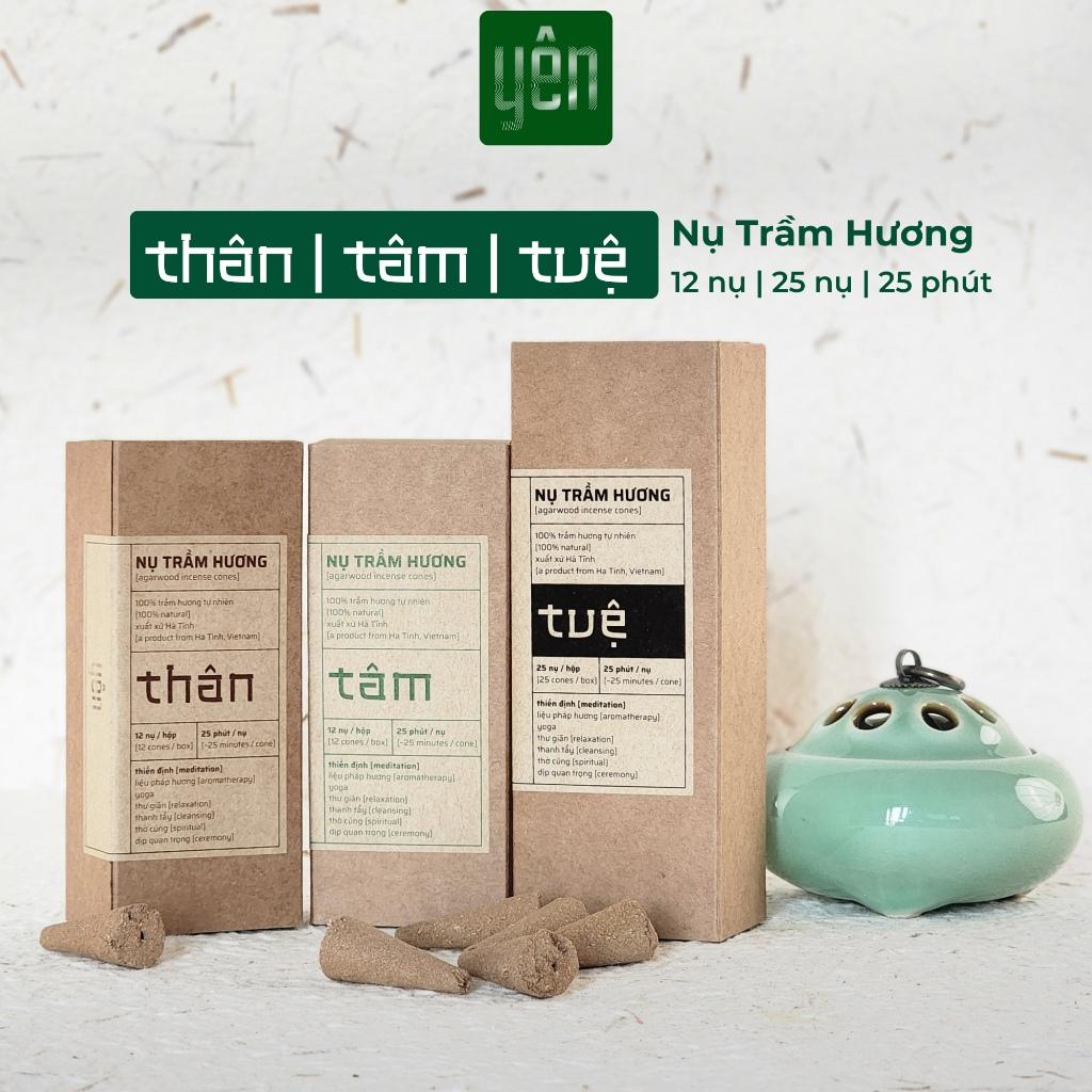 Nhang nụ trầm hương Yên Thảo Mộc – sạch tự nhiên, không hóa chất, ít khói, thơm nhẹ, phù hợp thiền, thờ, thư giãn.   I. Thông tin sản phẩm Nhang Nụ Trầm Hương Yên   Thương hiệu: Yên Thảo Mộc Xuất xứ: Hương Khê, Hà Tĩnh – vùng trầm hương danh tiếng tại Việt Nam Thành phần: 98% bột trầm hương tự nhiên từ dó bầu lâu năm, 2% keo bồi lời Trọng lượng: 1.5-2gr/nụ Thời gian cháy: 25-35 phút/nụ (tùy điều kiện không gian) Qui chuẩn: đã được đục lỗ, cháy tầm 5 phút sẽ có khói chảy ngược, tạo hiệu ứng thư giãn   Phân loại theo hộp ️Hộp 12 nụ ️Hộp 25 nụ   Phân loại theo tuổi trầm Thân – an lành (nâu): Trầm 7–12 năm tuổi, hương nhẹ, phù hợp thiền ngắn, xông hàng ngày Tâm – lắng đọng (xanh): Trầm 12–15 năm tuổi, hương sâu, hỗ trợ tĩnh tâm, yoga, kết nối nội tâm Tuệ – minh triết (đen): Trầm >15 năm, lọc kỹ, hương đậm đà, dùng thờ cúng, không gian linh thiêng Mix 3 loại trầm Thân-Tâm-Tuệ   Ưu điểm vượt trội Ít khói, không cay mắt, an toàn cho người mẫn cảm Hương thanh, nhẹ, không nồng, không gây mệt Sạch tự nhiên, không hóa chất Thân thiện với môi trường Đã kiểm nghiệm tại CASE – không chứa hóa chất   Quà tặng kèm vào các dịp sale lớn, ngày đôi, đầu tháng, giữa tháng và ngày lương về Ưu đãi chỉ áp dụng cho 50 đơn hàng đầu tiên trong tháng ️Luôn có mã giảm giá theo từng giá trị đơn Đóng gói kĩ đảm bảo an toàn Theo dõi shop để nhận ngay ưu đãi II. Công dụng sản phẩm Nhang Nụ Trầm Hương Yên   Thiền định, yoga: Tỏa hương giúp tĩnh tâm, giảm stress, tăng tập trung, khói chảy ngược thư giãn Thờ cúng: Thể hiện tấm lòng, thanh lọc không gian, thu hút vượng khí, kết nối tổ tiên Dùng hàng ngày: Thư giãn, xua mệt mỏi, làm mát không gian, dùng cho lễ Tết   III. Hướng dẫn sử dụng Nhang Nụ Trầm Hương Yên   ️Lấy nhang nụ nhẹ nhàng tránh gãy đầu nụ ️Bảo quản nơi khô ráo, thoáng mát ️Đóng nắp hộp sau khi dùng ️Nếu bị ẩm, phơi nắng sáng nhẹ tầm 30 phút hoặc cho vào lò vi sóng tầm 5 giây   IV. Cam kết từ Yên Thảo Mộc   100% trầm hương Hương Khê tự nhiên – không pha tạp KHÔNG hóa chất, KHÔNG hương liệu nhân tạo Đồng hành cùng làng nghề Trầm Tùng Lộc   V. Yên Thảo Mộc Yên tự tâm   Yên Thảo Mộc thương hiệu nhang sạch truyền thống 3 đời cha truyền con nối từ làng nghề Tùng Lộc (Hà Tĩnh), chuyên sản xuất nhang và nụ thảo mộc tự nhiên, không hóa chất, hỗ trợ sống lành, thiền định và kết nối tâm linh.   Mua để trải nghiệm nhang trầm hương sạch từ vùng trầm Hương Khê! Cây dó bầu ở Hương Khê phần lớn được trồng theo mô hình bán tự nhiên hoặc để phát triển tự nhiên trong rừng ️ trầm lên chậm, ít bị can thiệp nhân tạo. Trầm từ vùng này thường có màu nâu xám, vân dầu nhỏ nhưng đều, thơm thanh nhẹ – bền mùi. Trầm Hương Khê không gắt, không nồng mà mang mùi hương dịu, thoảng, có chiều sâu, không lấn át khứu giác️phù hợp để làm nhang sạch – ít khói, đặc biệt là thiền, yoga, xông nhà, sử dụng hàng ngày mà không gây mệt hay kích ứng.
