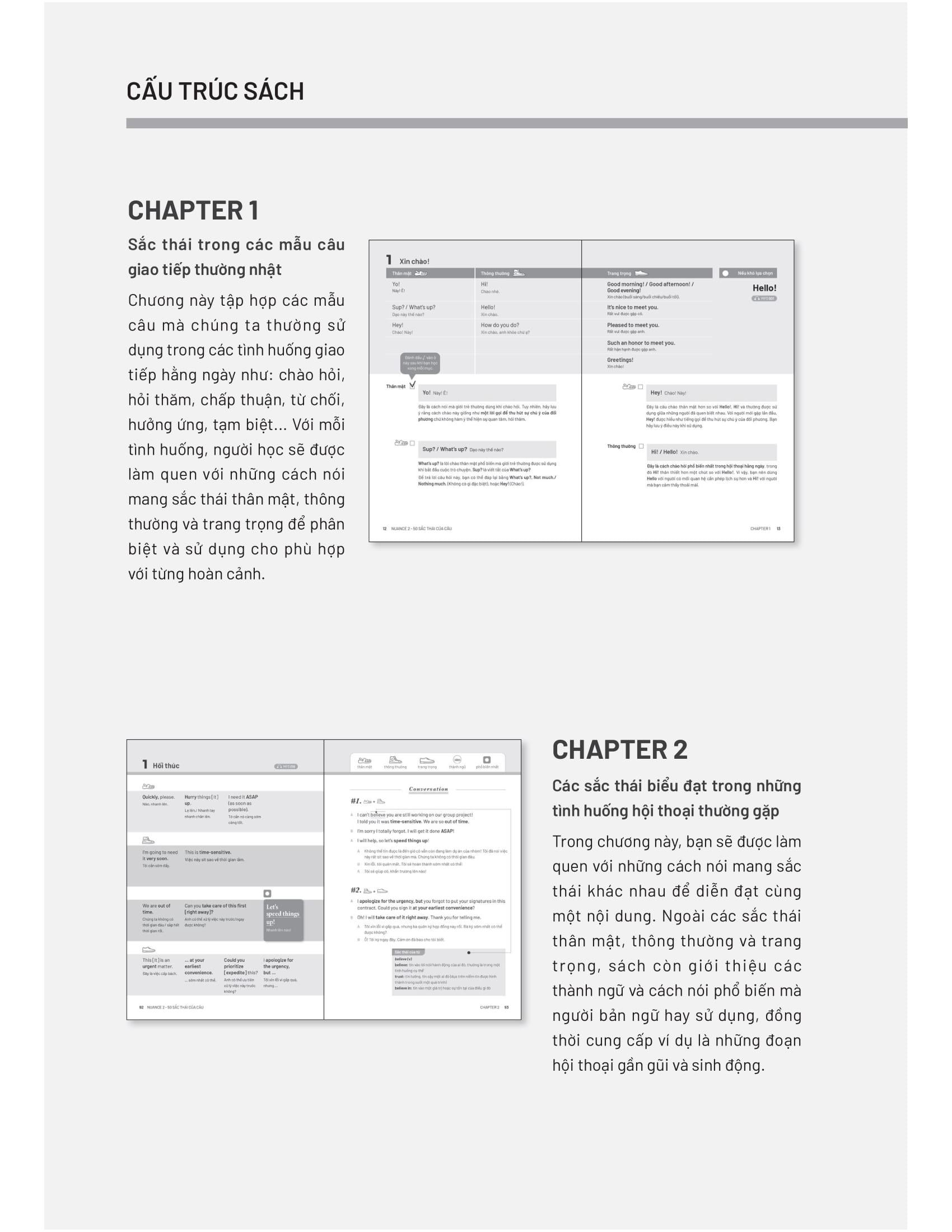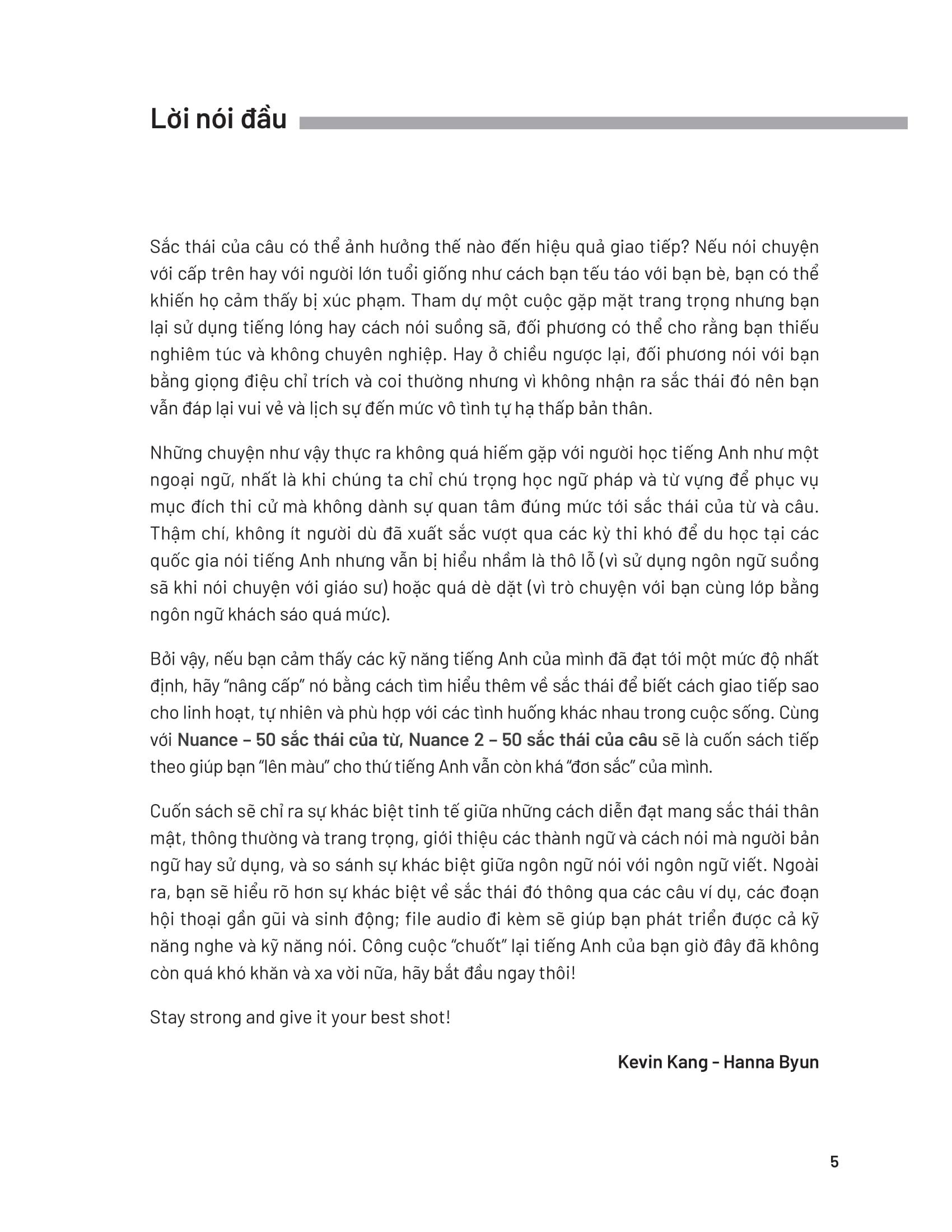 Nuance 2 – 50 sắc thái của câu là phần tiếp theo của cuốn sách bán chạy Nuance - 50 sắc thái của từ. Với cuốn sách này, bạn sẽ được tìm hiểu về sắc thái của các cách diễn đạt khác nhau trong tiếng Anh, từ đó biết cách giao tiếp linh hoạt, tự nhiên và phù hợp với từng tình huống cụ thể trong cuộc sống.