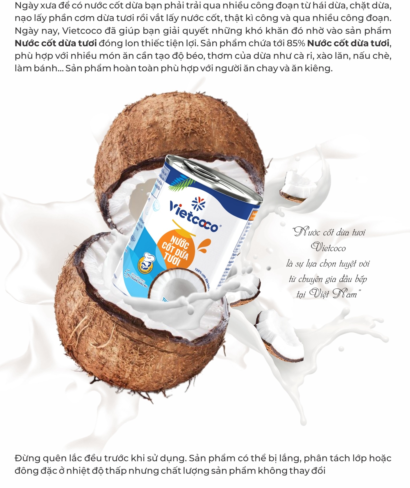 Sản phẩm: Nước cốt dừa Vietcoco - dùng cho món ngọt Thương hiệu: Vietcoco Dung tích: 160ml/ lon Giữ lạnh (4-8 độ C) và sử dụng trong vòng 72h sau khi mở nắp Phù hợp với người ăn chay và ăn kiêng Nước cốt dừa Vietcoco là trợ thủ đắc lực giúp bạn có bữa ăn ngon, đầy đủ dinh dưỡng mà vẫn đảm bảo chuẩn vị tự nhiên! Được chắt lọc từ cơm dừa (cùi dừa) hảo hạng của Bến Tre, được phối trộn cùng với công thức vô cùng đặc biệt phù hợp để chế biến các món ăn như: các món chè (chè thái, chè khúc bạch, chè bánh lọt, sương sáo,...), làm bánh,... Nước cốt dừa tươi Vietcoco là sự kết hợp giữa công thức truyền thống và ứng dụng công nghệ sản xuất hiện đại, sản phẩm của quá trình ép cơm dừa tươi chắt lọc thành từng dòng nước cốt dừa tươi đậm đặc và sánh mịn. Ngày nay nước cốt dừa tươi đã trở thành một thành phần thiết yếu trong các công thức nấu ăn vùng nhiệt đới và Châu Á, và như một gia vị đặc biệt của các chuyên gia đầu bếp hàng đầu thế giới. Đối với người tiêu dùng có ý thức về sức khỏe và chú trọng lối sống lành mạnh thì nước cốt dừa tươi Vietcoco là sự lựa chọn hoàn hảo!