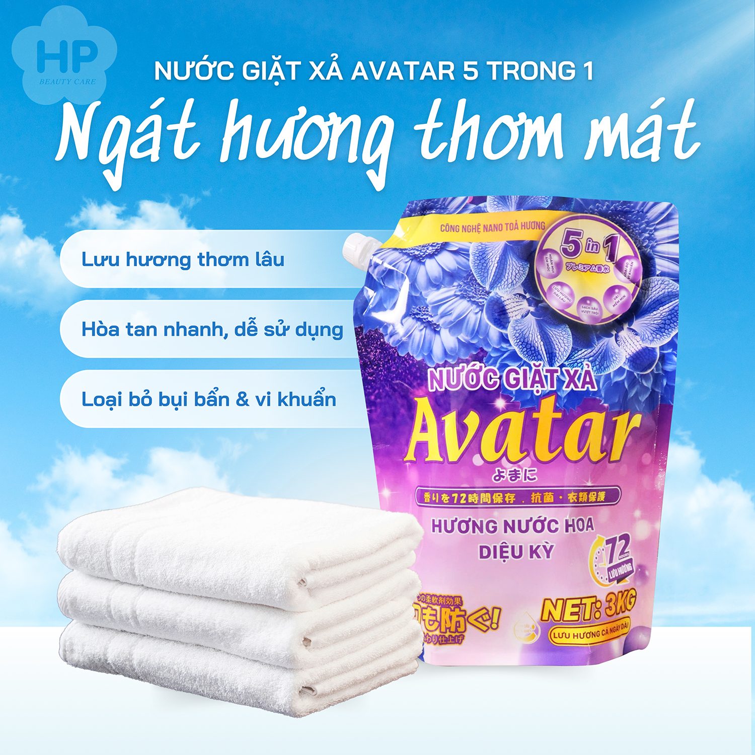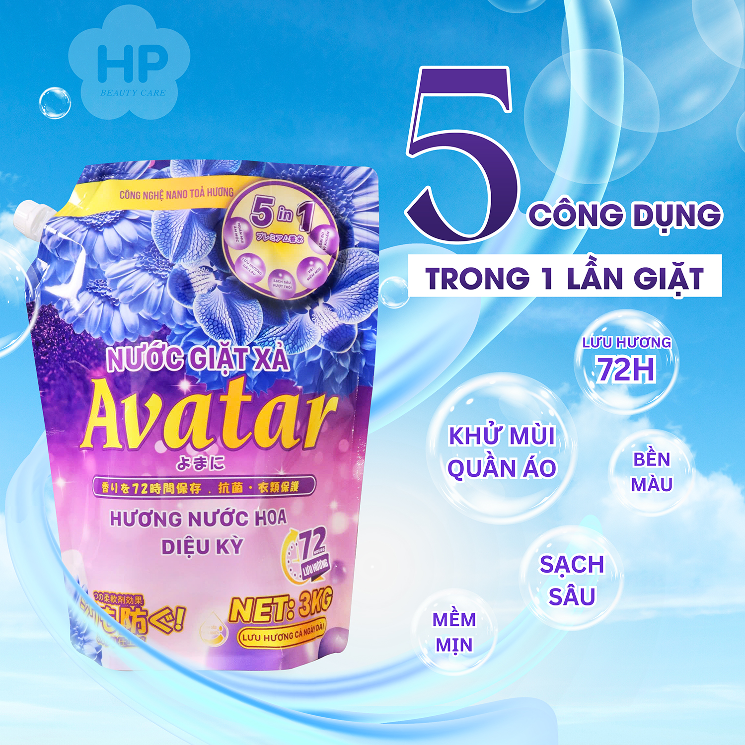 NƯỚC GIẶT XẢ AVATAR 5 TRONG 1 HƯƠNG HOA CỎ LƯU HƯƠNG 72H (TÚI 3KG) Số Lô: in trên sản phẩm Xuất Xứ: Việt Nam Khối lượng tịnh: 3kg Mã Vạch: 8936183971054 Công dụng