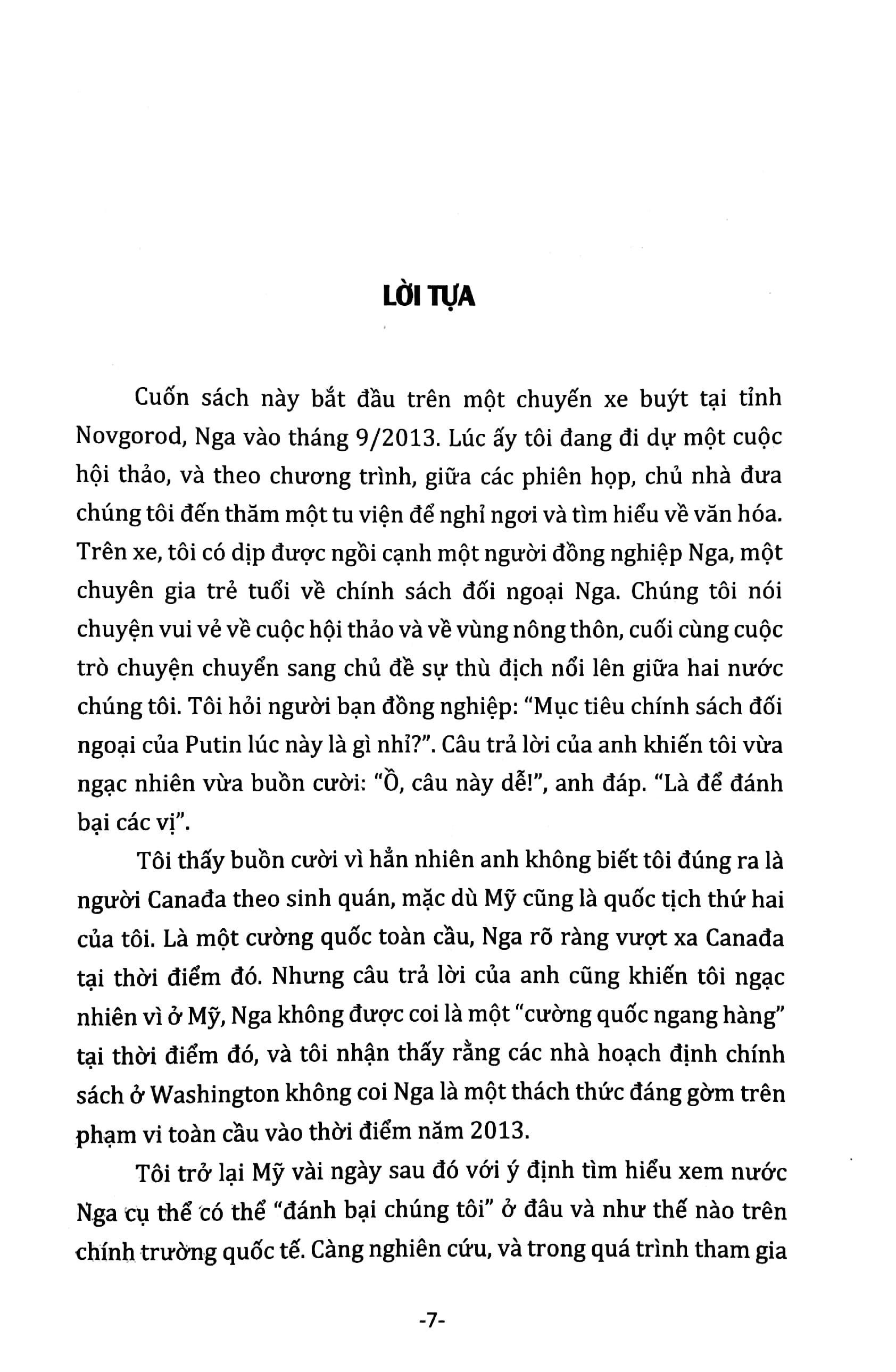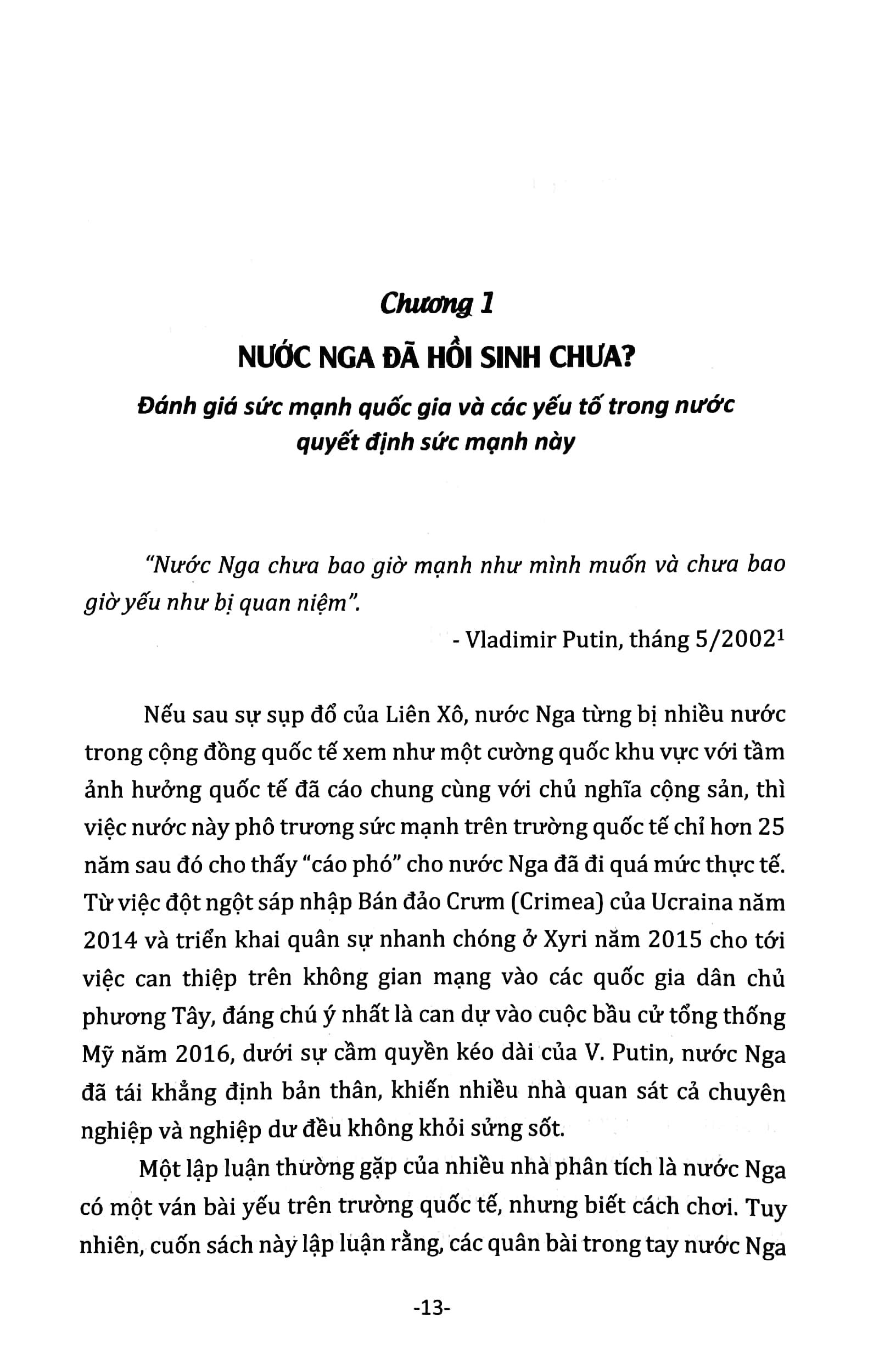 Từ nguồn dữ liệu tổng hợp về những bước phát triển chính trị, kinh tế và xã hội của Nga, cuốn sách gợi mở để bạn đọc tìm thấy lời giải cho các câu hỏi: tại sao cơ chế quản trị đặc thù của chính quyền Putin nhằm duy trì quyền kiểm soát quốc gia trong các vấn đề chính trị nội bộ và chính sách đối ngoại mà các thế lực đối trọng Nga coi là “phi tự do” lại hầu như không gặp phải sự chống đối có tổ chức nào ở trong nước? Tại sao người Nga giàu hơn người Trung Quốc tính theo GDP bình quân đầu người; nước Nga có tỷ lệ nợ thấp nhất thế giới và chính sách tài khóa rất hiệu quả, bất chấp lệnh trừng phạt của Mỹ và các nước phương Tây từ năm 2014 sau sự kiện Nga sáp nhập Crưm bất kể thực trạng nền kinh tế toàn cầu đầy biến động? Xã hội Nga dưới thời Putin, dù vẫn phải đối mặt với thách thức về vốn con người, đã chuẩn bị những chiến lược dài hạn như thế nào để thực thi hiệu quả quyền lực đáng gờm trên phạm vi rộng lớn hơn thay vì chỉ bó hẹp trong khu vực lân cận?