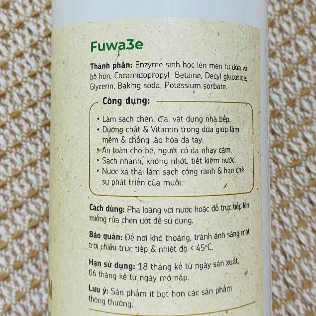 Nước rửa chén Fuwa3e được lên men enzym từ Dứa & bồ hòn tẩy rửa dầu mỡ hiệu quả và khử mùi tốt, tiết kiệm nước, an toàn cho đồ dùng em bé