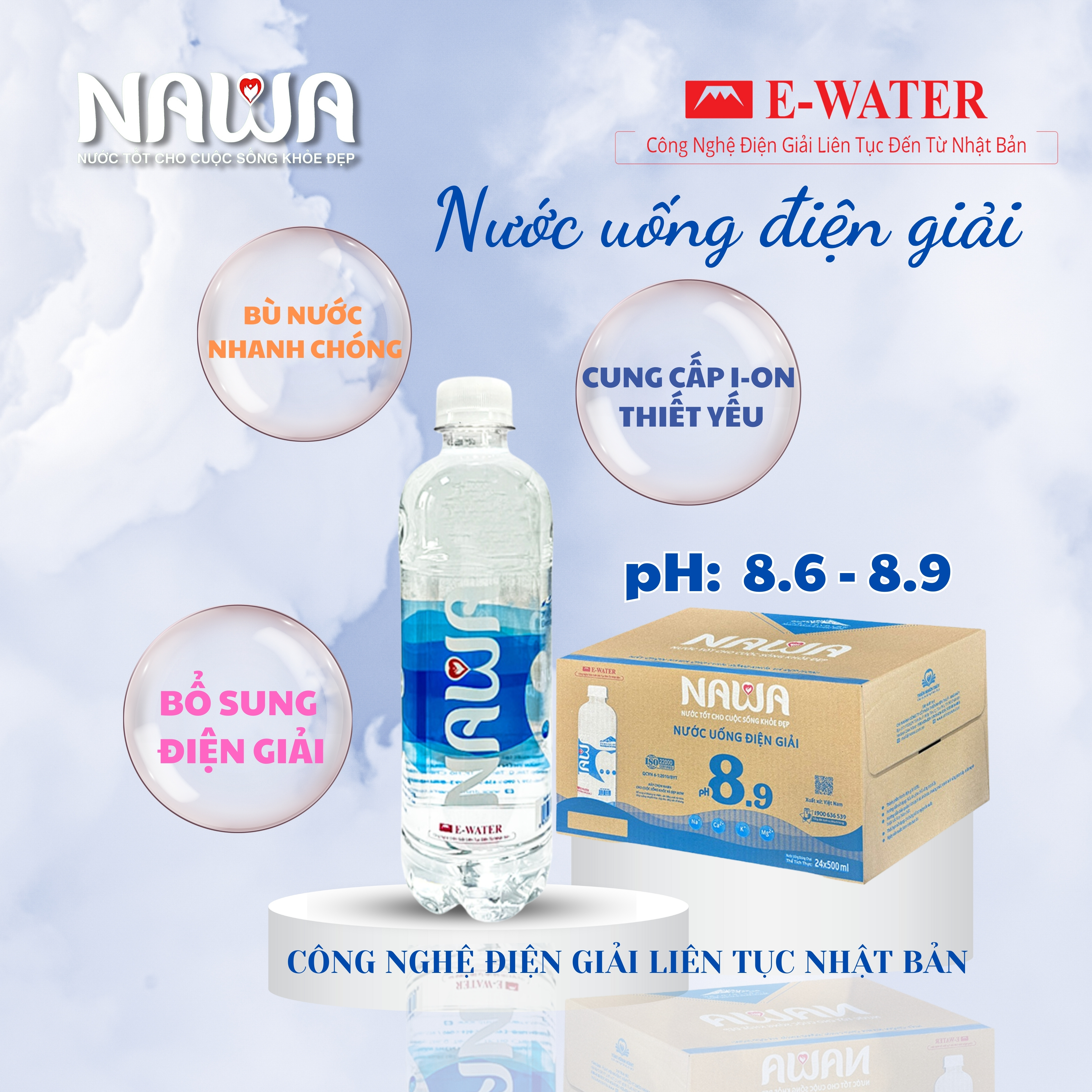 Nước uống điện giải NAWA được sản xuất bằng công nghệ E-Water là công nghệ điện giải liên tục do chính các chuyên gia nhật triển khai tại Việt Nam từ năm 1996. Đây cũng chính là điểm khác biệt để tạo lên giá trị của dòng nước NAWA so với các dòng khác trên thị trường. Nước được điện giải liên tục 26 giờ để tạo ra nhiều i-on OH- làm kiềm hóa nước với pH đạt từ 8.6 đến 9.0, đồng thời giải phóng nhiều i-on khoáng chất có lợi và cần thiết cho thể như Na+, Ca2+, K+ và Mg2+ Đặc điểm và lợi ích khi sử dụng nước uống điện giải NAWA: