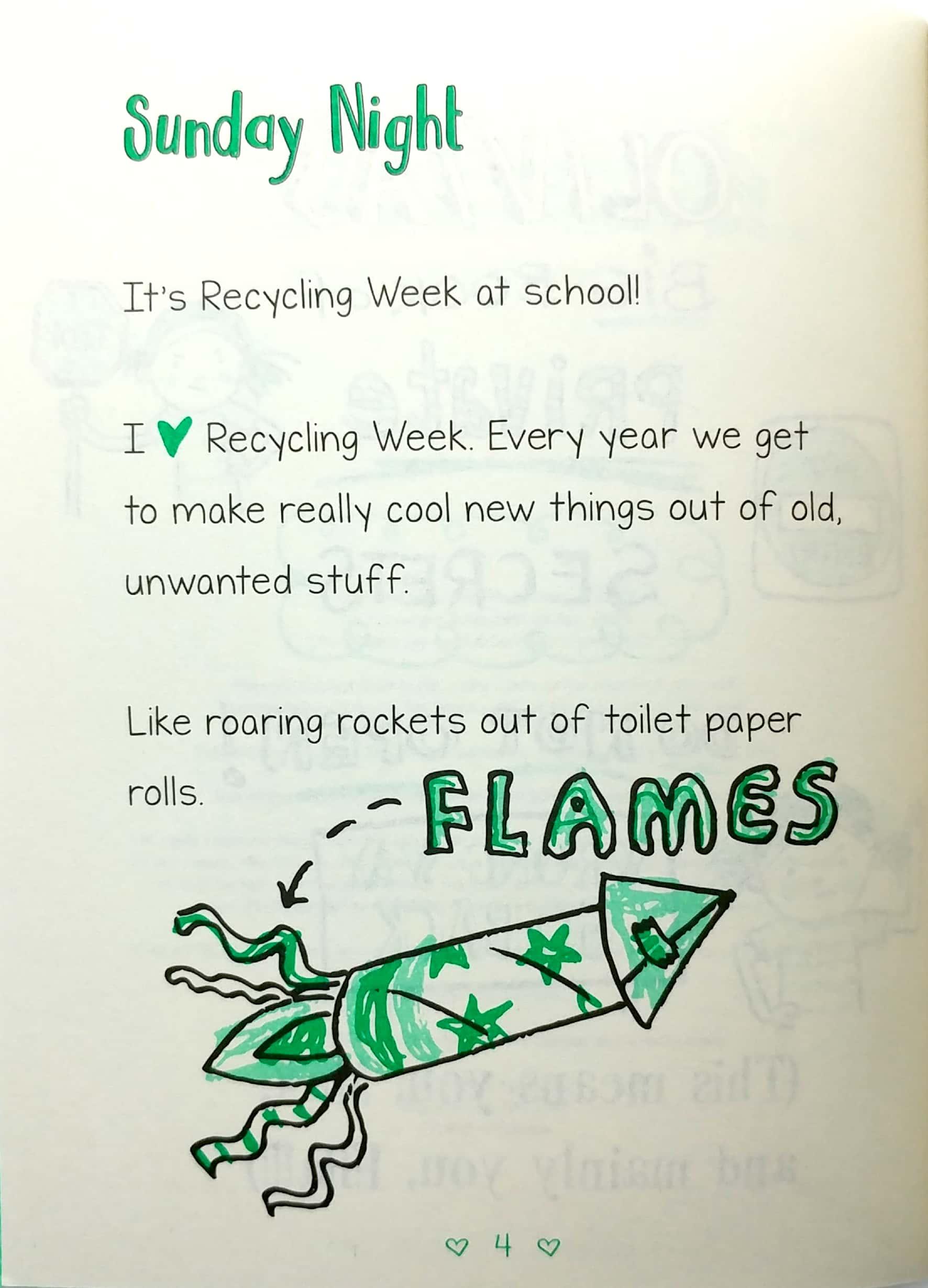 I have so many super-amazing and IMPORTANT things to write about! Ill tell you all about them: Its Recycling Week at school!!! Matilda and I have made box cars. Our idea is so super-amazing that our whole class is going to make box cars so we can have a race!!! But why hasnt Bethany made a box car? And why is she acting so sad? Sounds like she might need my help. Matilda and Olivia to the rescue!