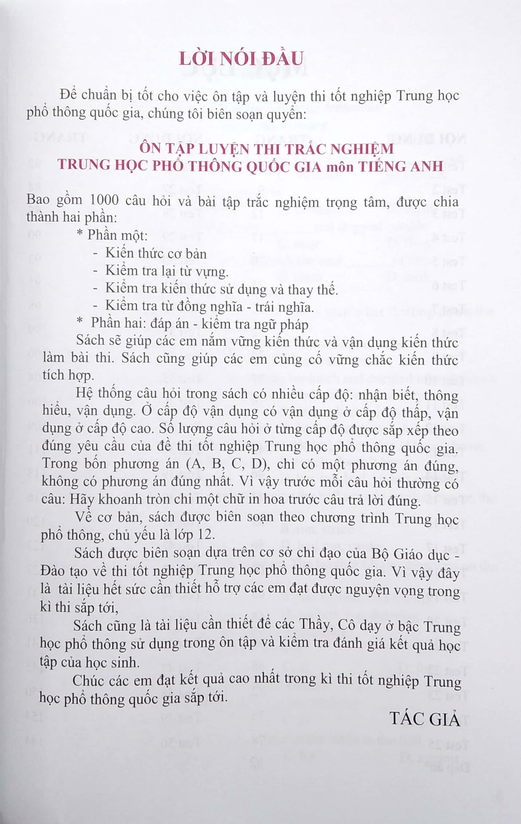 Để chuẩn bị tốt cho việc ôn tập và luyện thi tốt nghiệp Trung học phổ thông quốc gia, chúng tôi biên soạn quyền: ÔN TẬP LUYỆN THI TRẮC NGHIỆM TRUNG HỌC PHỔ THÔNG QUỐC GIA môn TIẾNG ANH